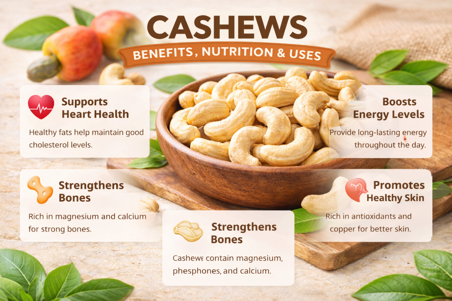 Cashews are delicious and nutritious dry fruits packed with healthy fats, protein, vitamins, and essential minerals. They support heart health, boost energy, strengthen bones, and improve skin health. Learn about the health benefits, nutrition facts, and best ways to eat cashew nuts.
