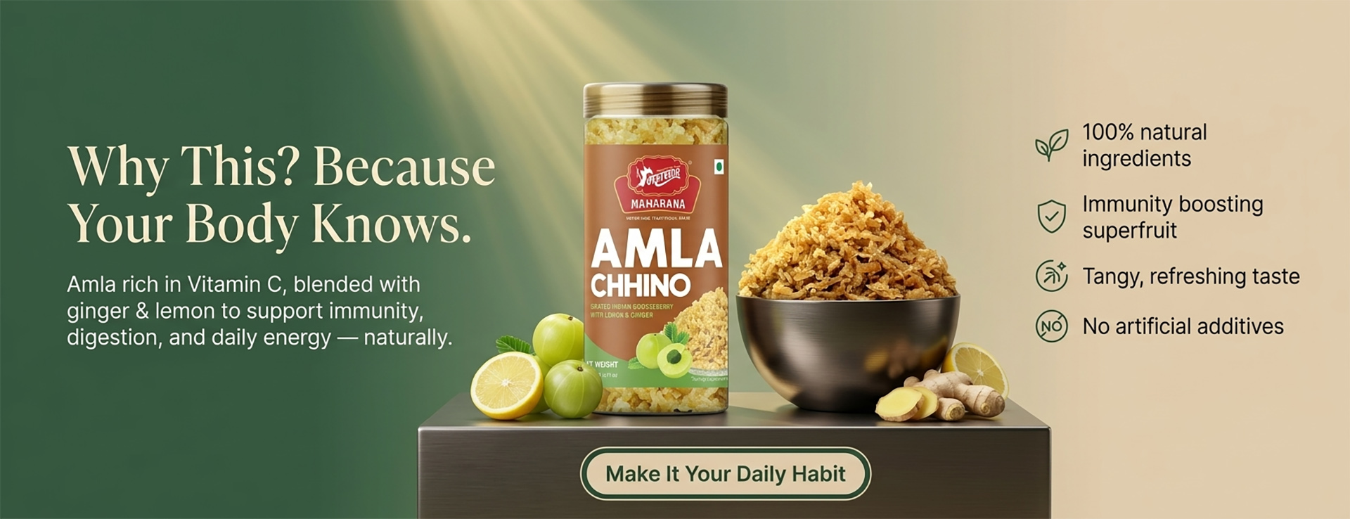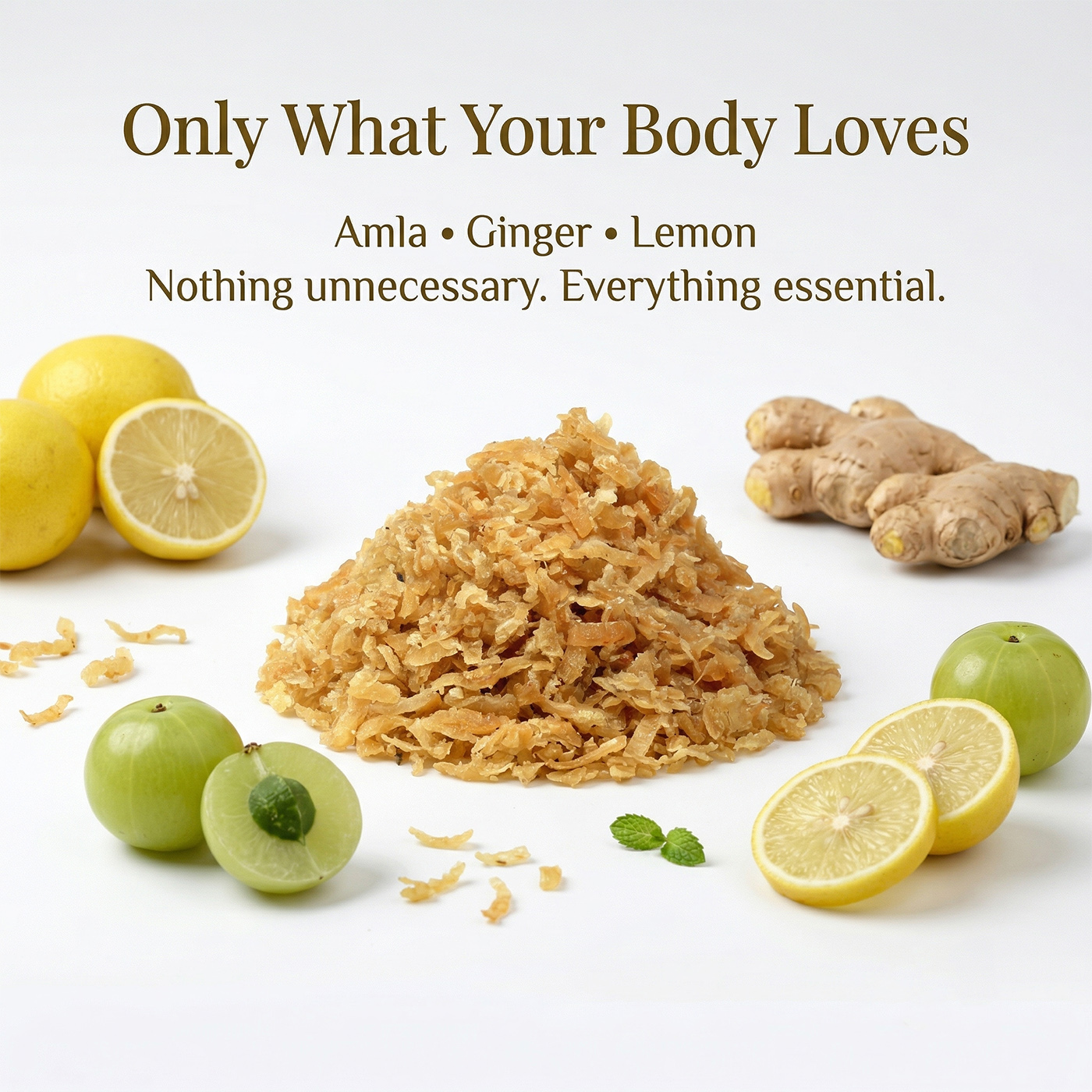 It contains grated sundried amla, ginger, lemon, sugar, and a pinch of salt, with no artificial colors and minimal preservatives.