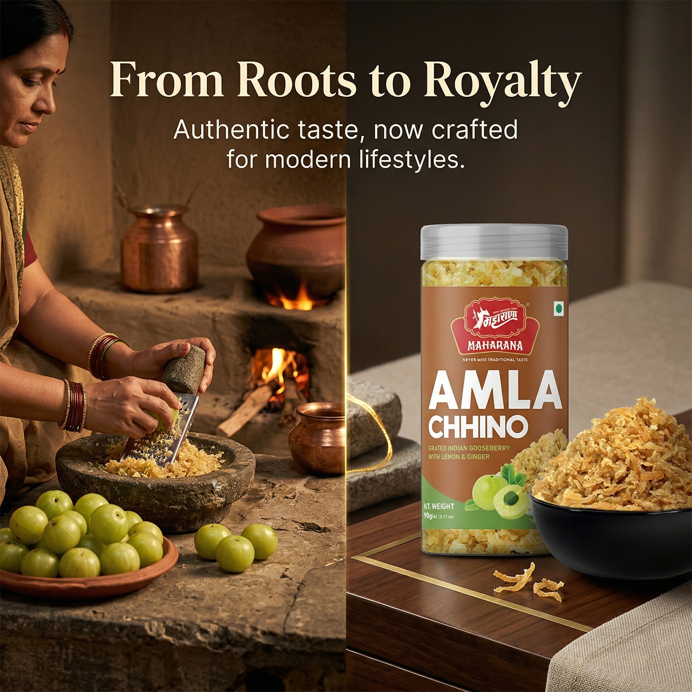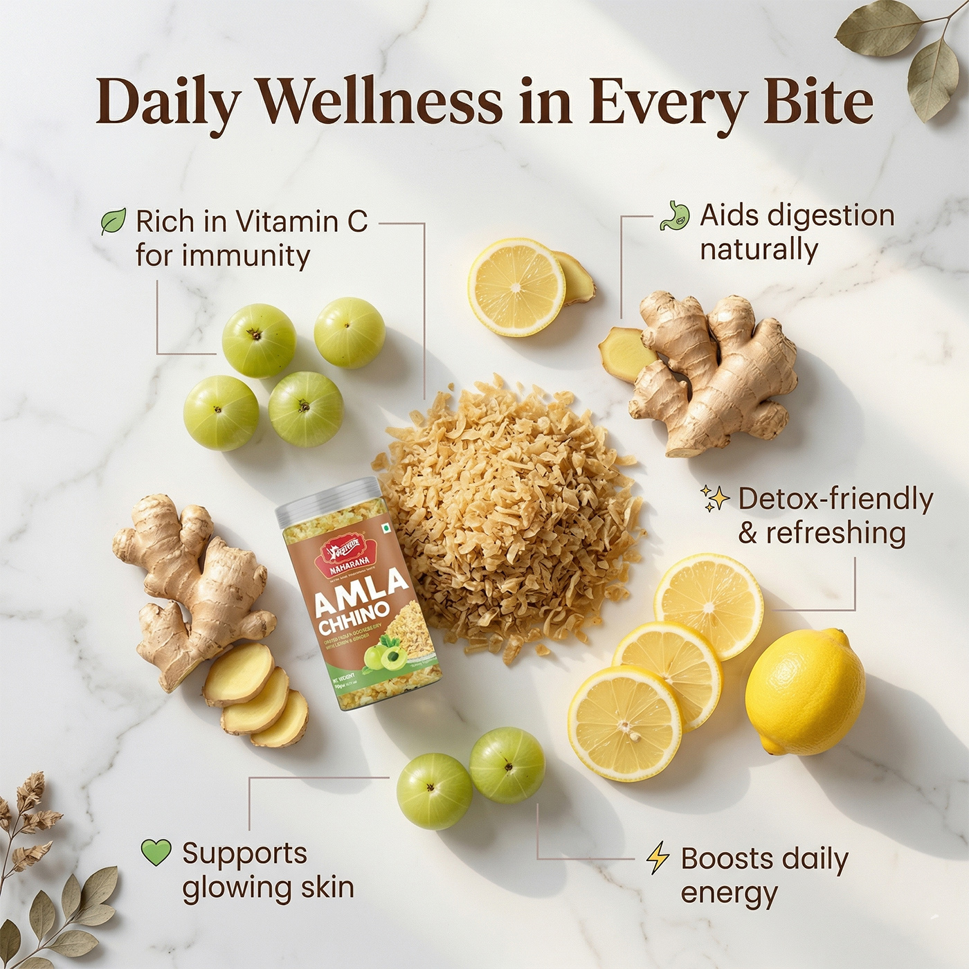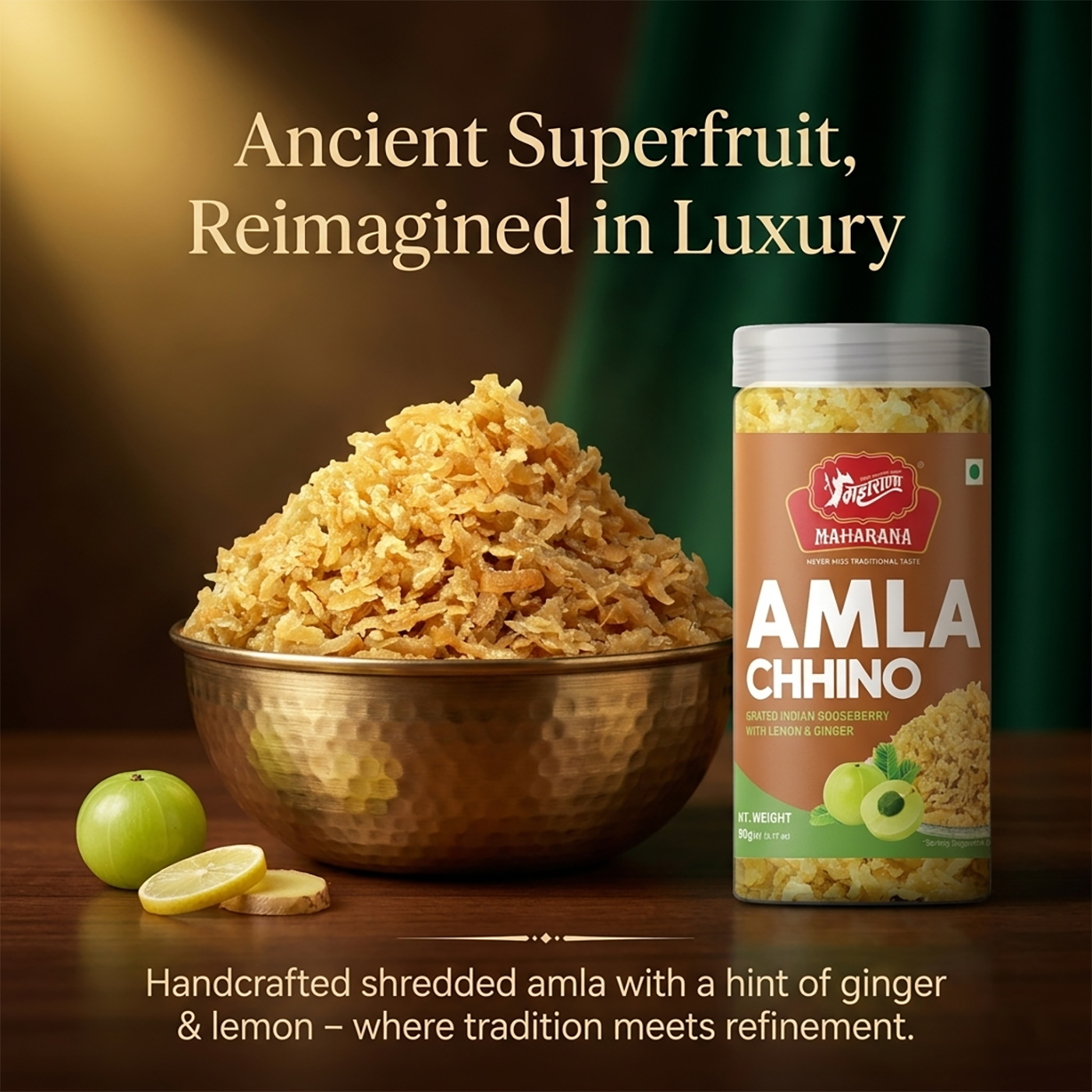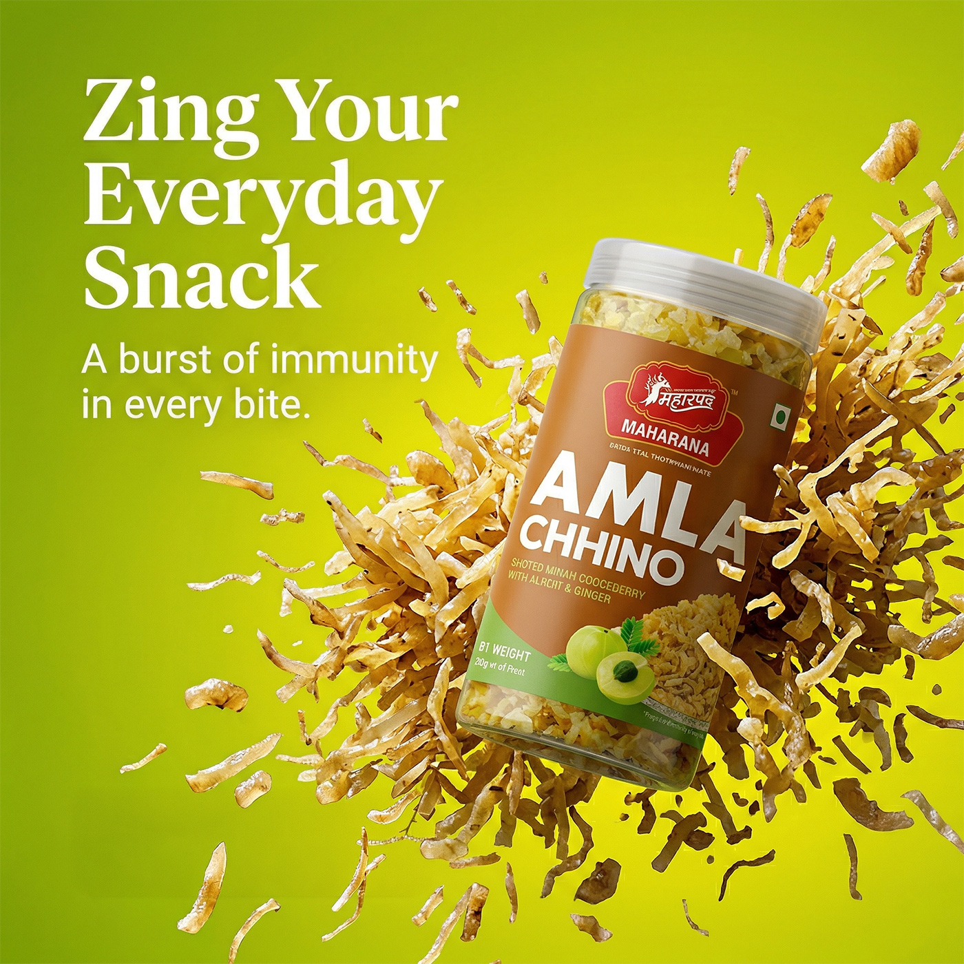 Amla chhino is a grated and sundried amla shred snack flavored with ginger and lemon. it serves as a mouth freshener and is packed with essential vitamins such as vitamin c and iron.