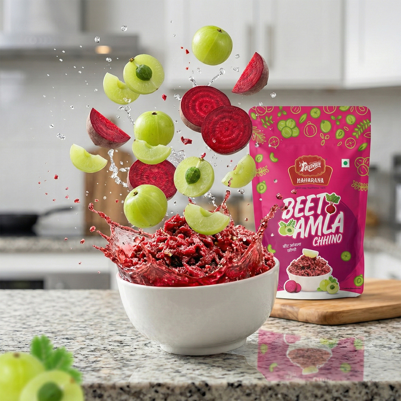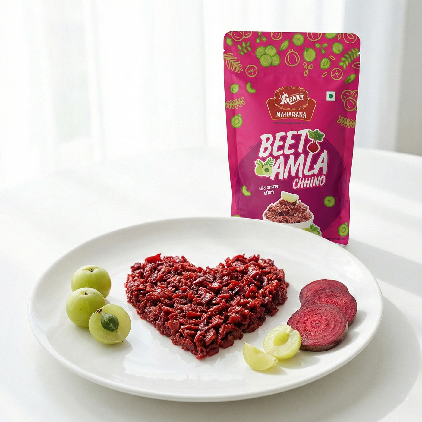 Beet amla chhino is packaged by maharana foods and made in india under hygienic conditions. product details and batch codes are printed on each pack for quality assurance.