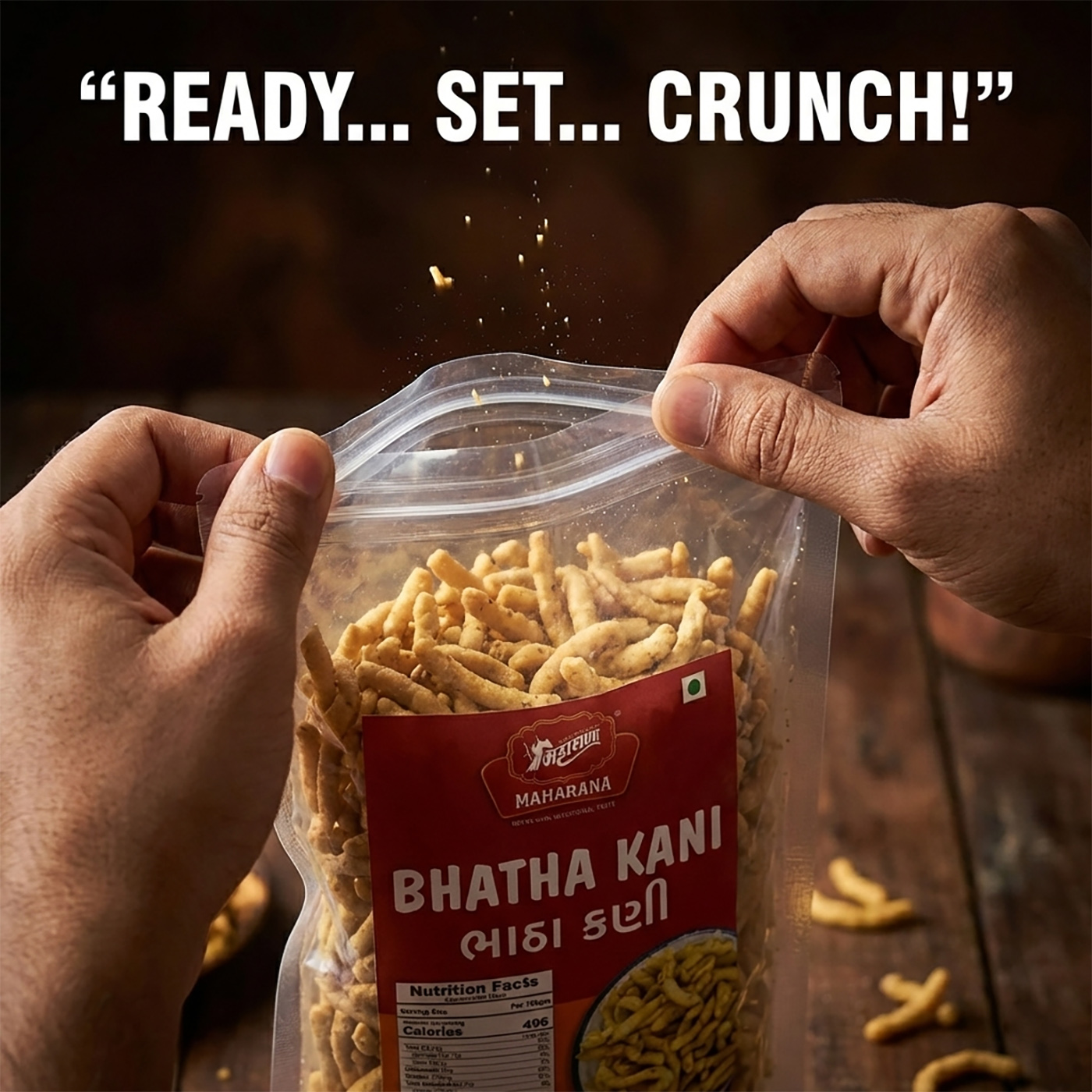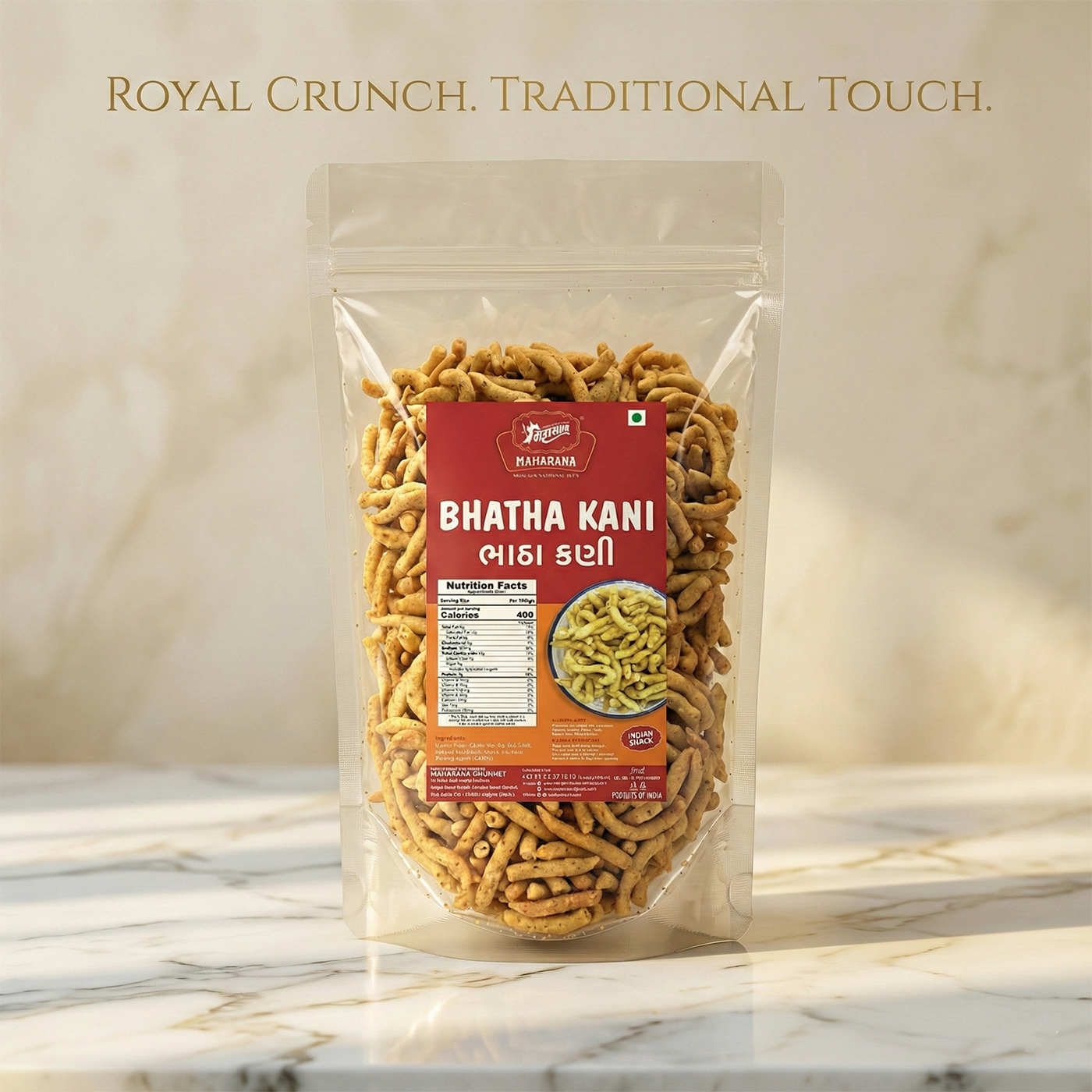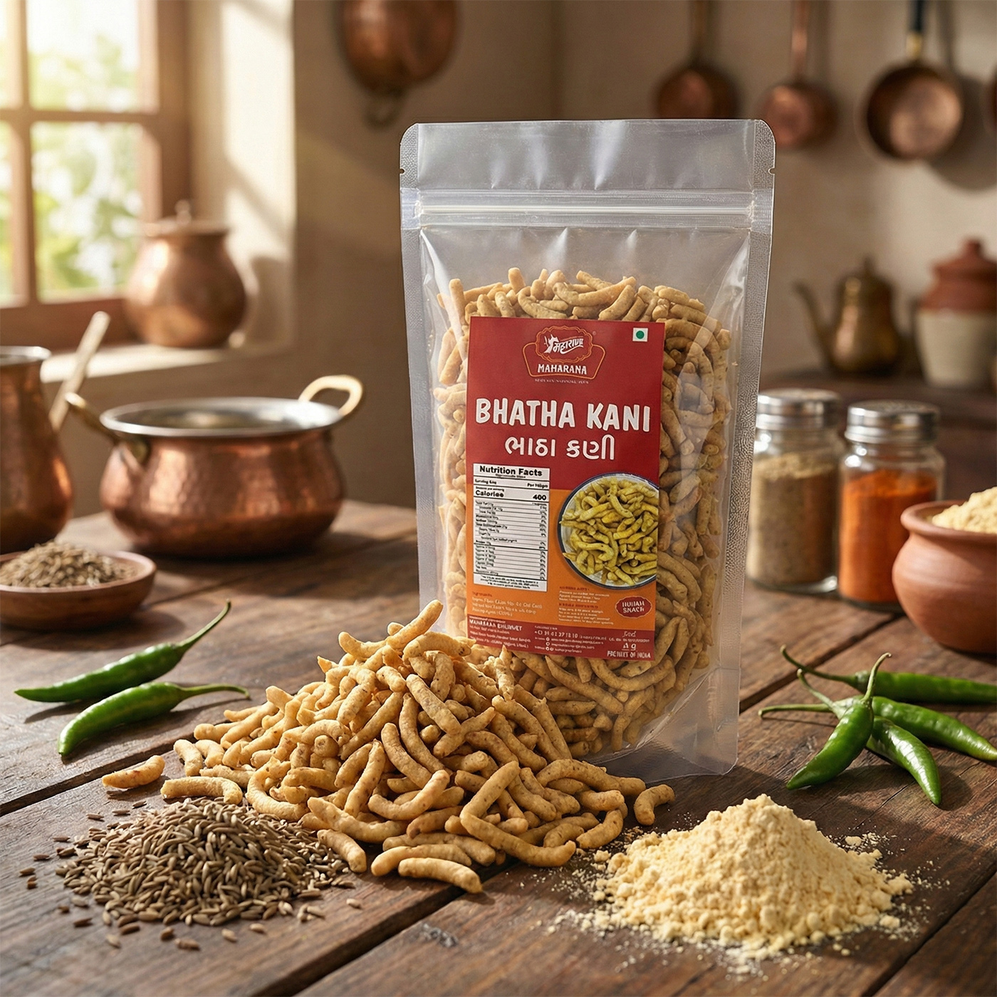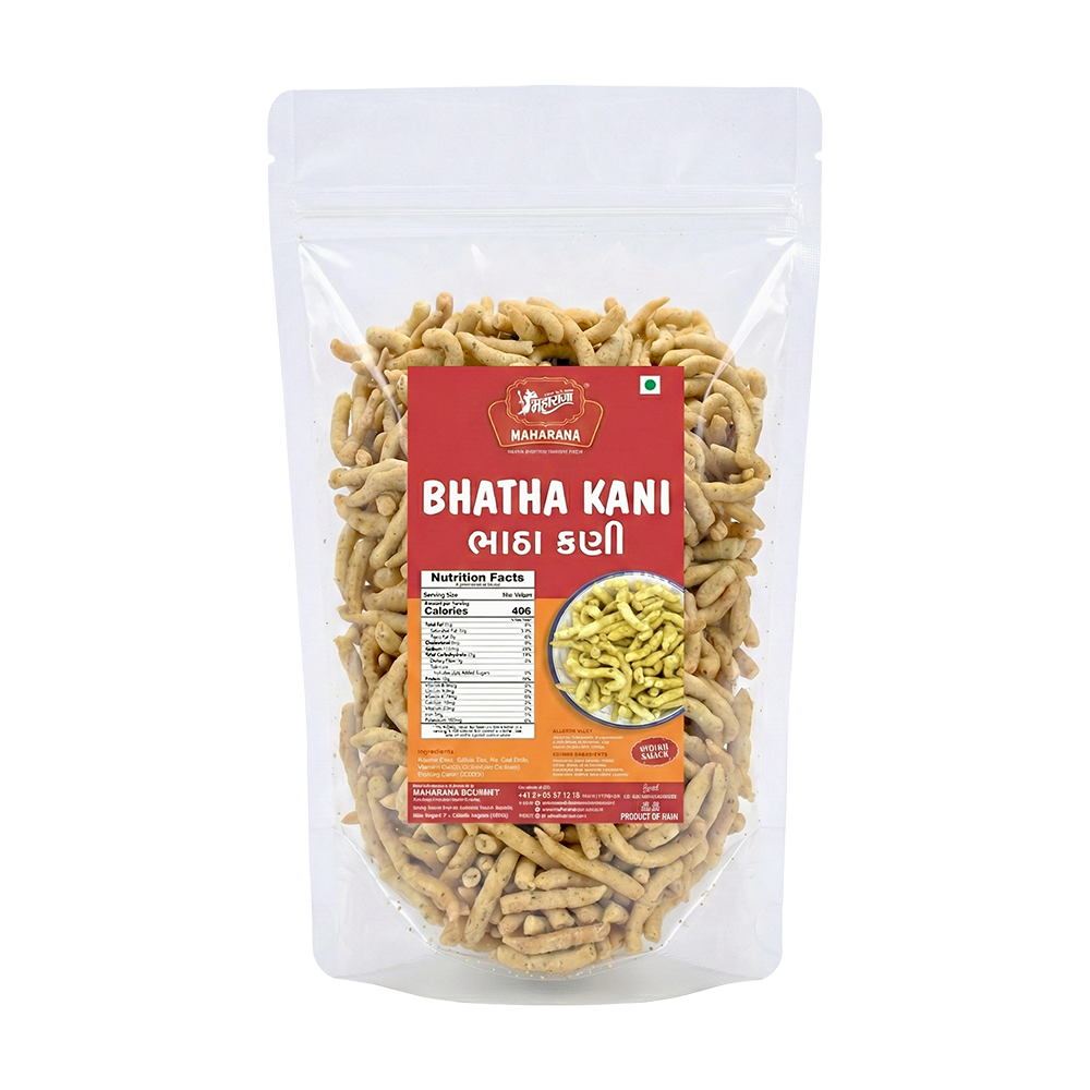 Bhatha kani is prepared using gram flour (besan), edible vegetable oil, cumin seeds, salt, chili powder, turmeric, and other permitted spices, which are combined to create a tangy and spicy crunchy snack.