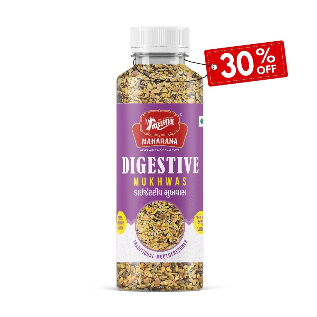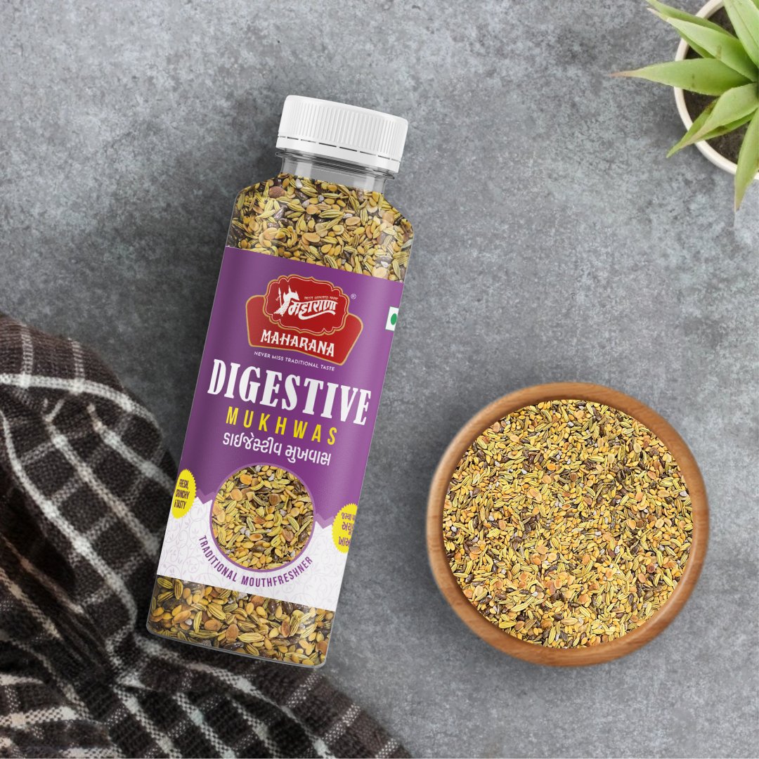 Digestive mukhwas is a traditional indian mouth freshener and digestive aid made from a blend of ajwain, coriander seeds, sesame seeds, fennel seeds, and natural rock sugar. it is designed to support digestion and freshen breath after meals.
