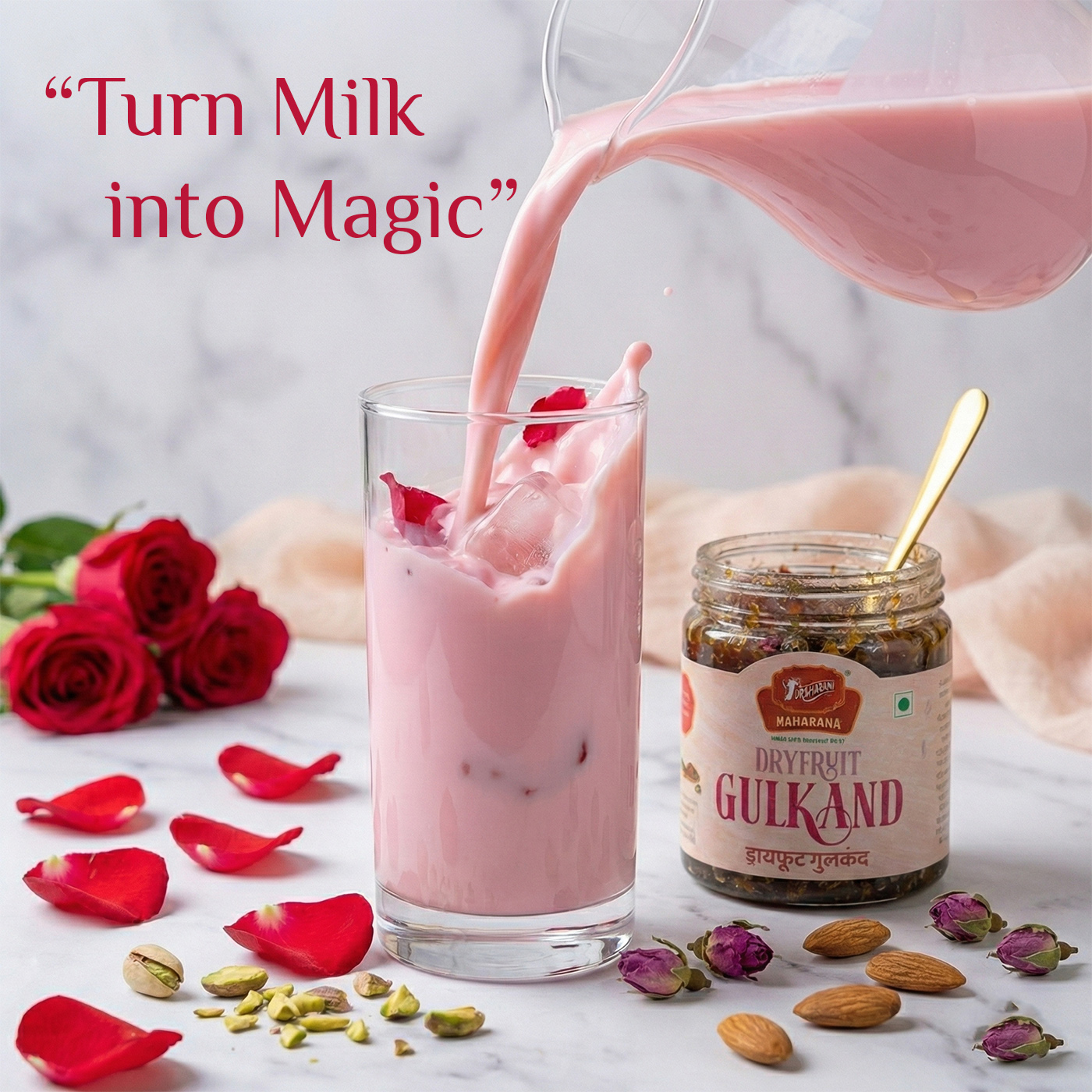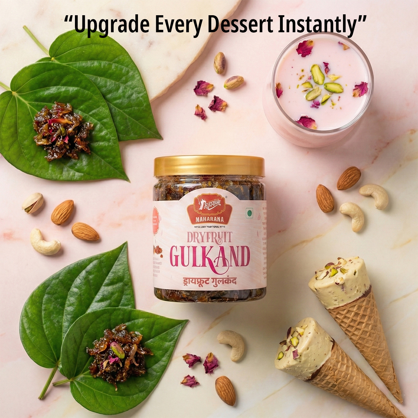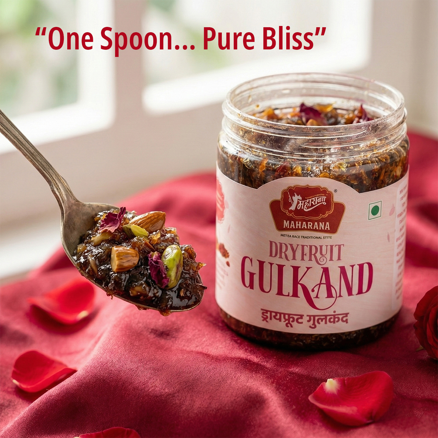 Dryfruit gulkand is a traditional ayurvedic delight made from fresh damask rose petals and natural rock sugar, sourced from the hills of pushkar, rajasthan. it is a rose petal jam prepared using a sun-cooking process that retains its natural aroma, taste, and nutritional benefits.