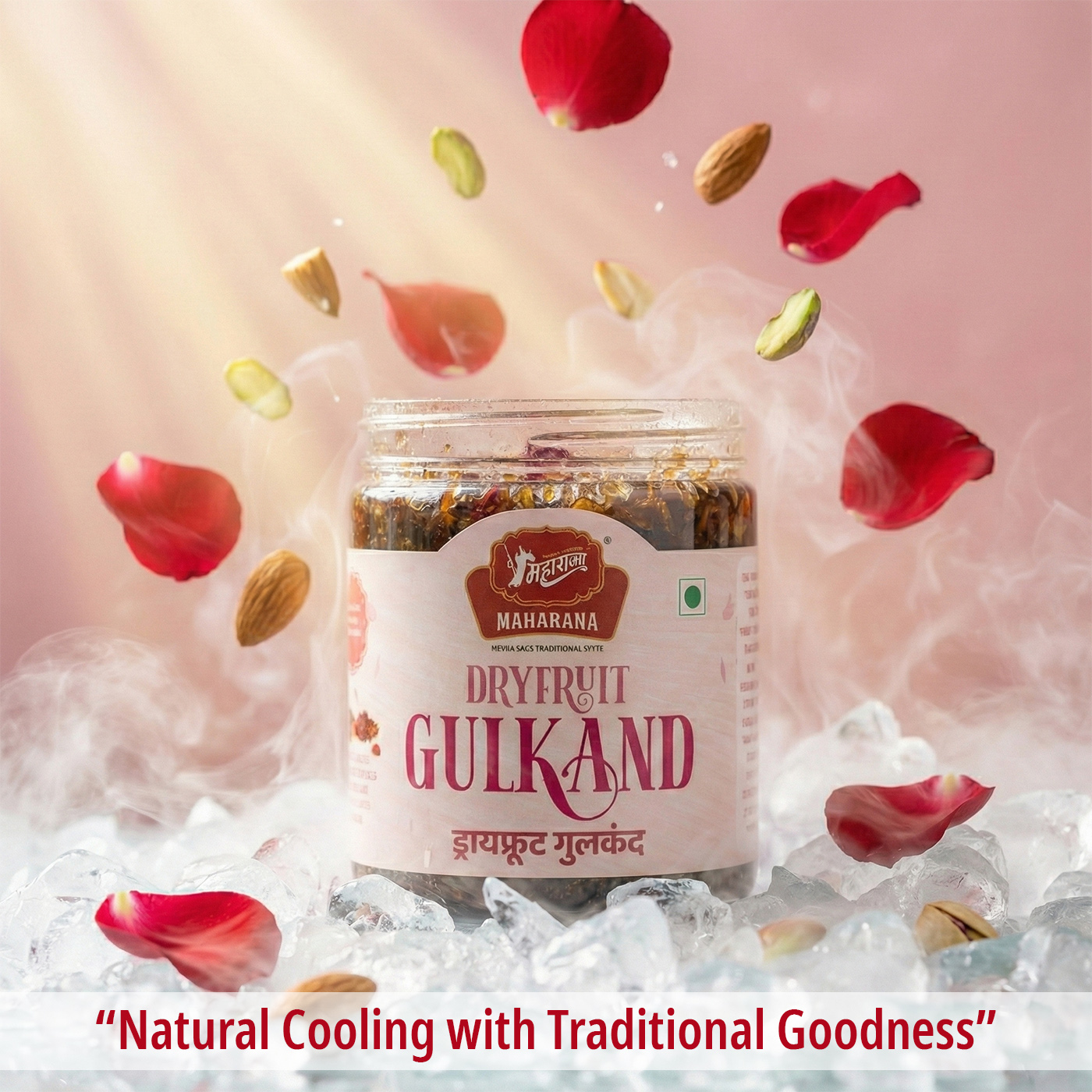 Dryfruit gulkand acts as a natural cooling agent and antioxidant. it helps reduce heat-related issues like fatigue, lethargy, itching, muscle discomfort, and stomach heat by providing soothing and rejuvenating effects following traditional ayurvedic principles.