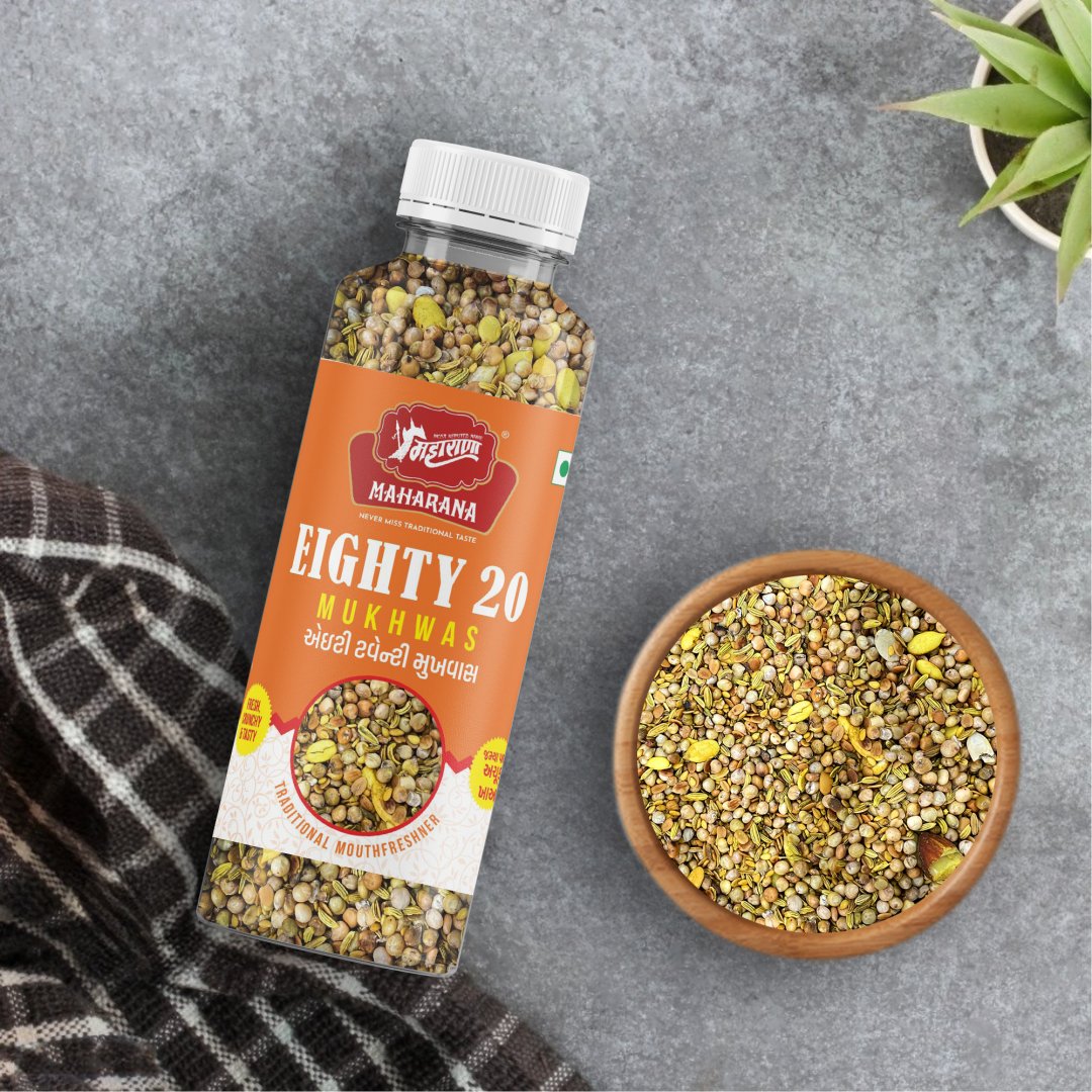 Eighty 20 mukhwas is a traditional gujarati blend of roasted cashews, almonds, watermelon seeds, sorghum, and coriander seeds. it is designed as a mouth freshener and digestive aid.