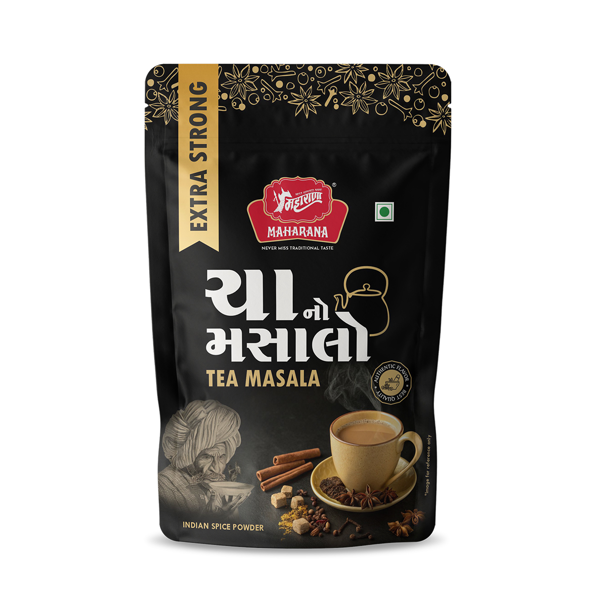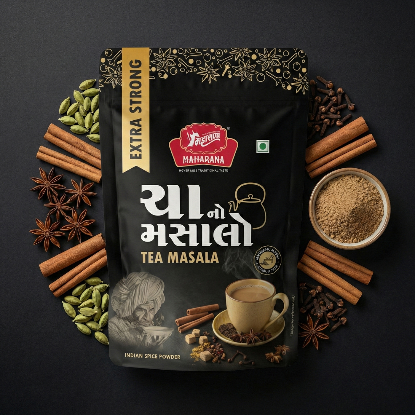 Ex. strong tea masala is a specially prepared blend of spices including white pepper, black pepper, dry ginger, cinnamon, green cardamom, nutmeg, mace, paper root, and clove, designed to enhance the flavor and aroma of tea.