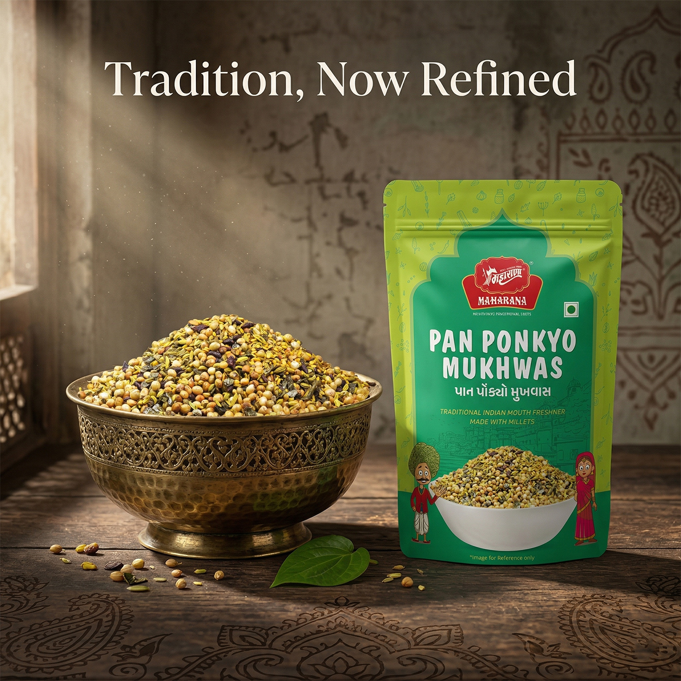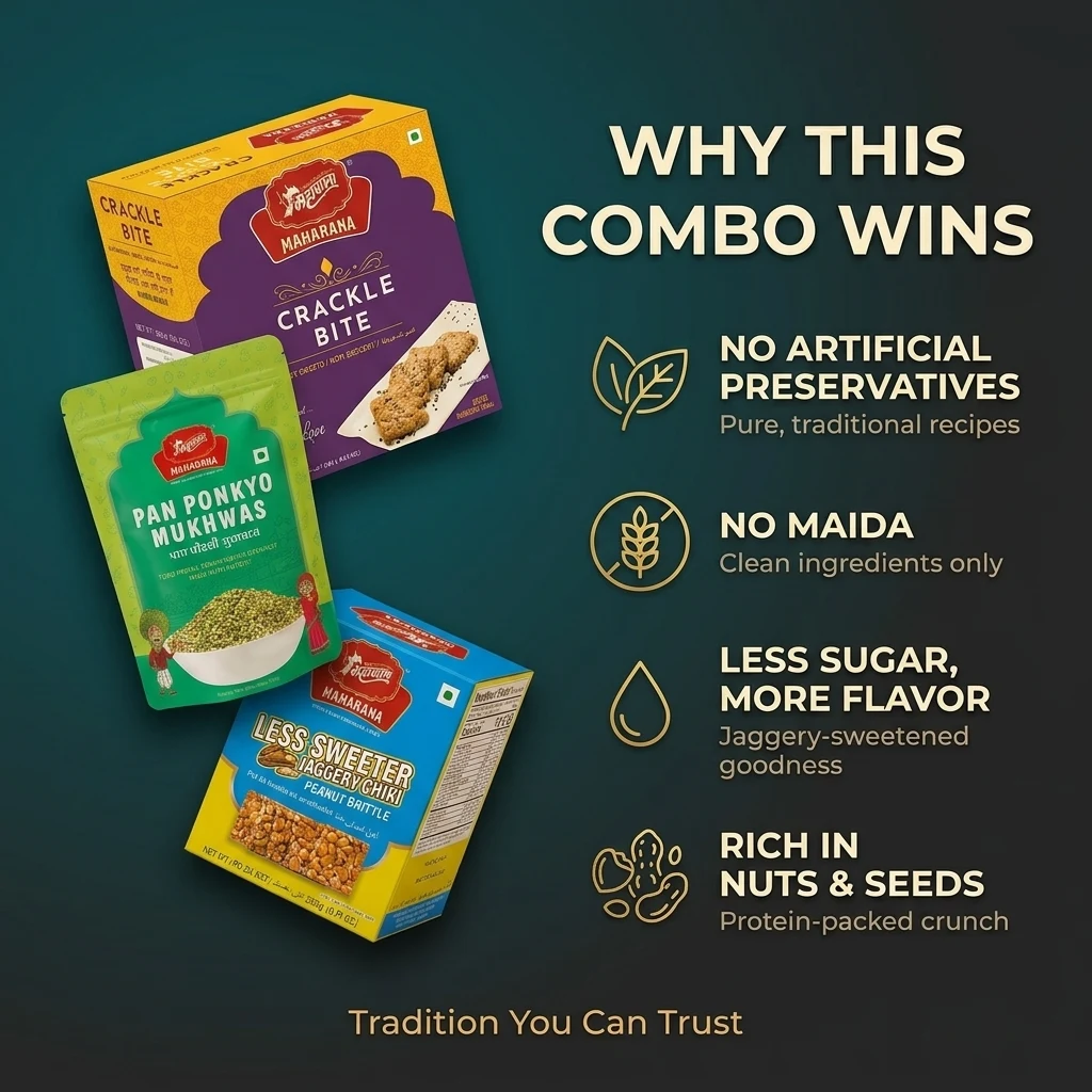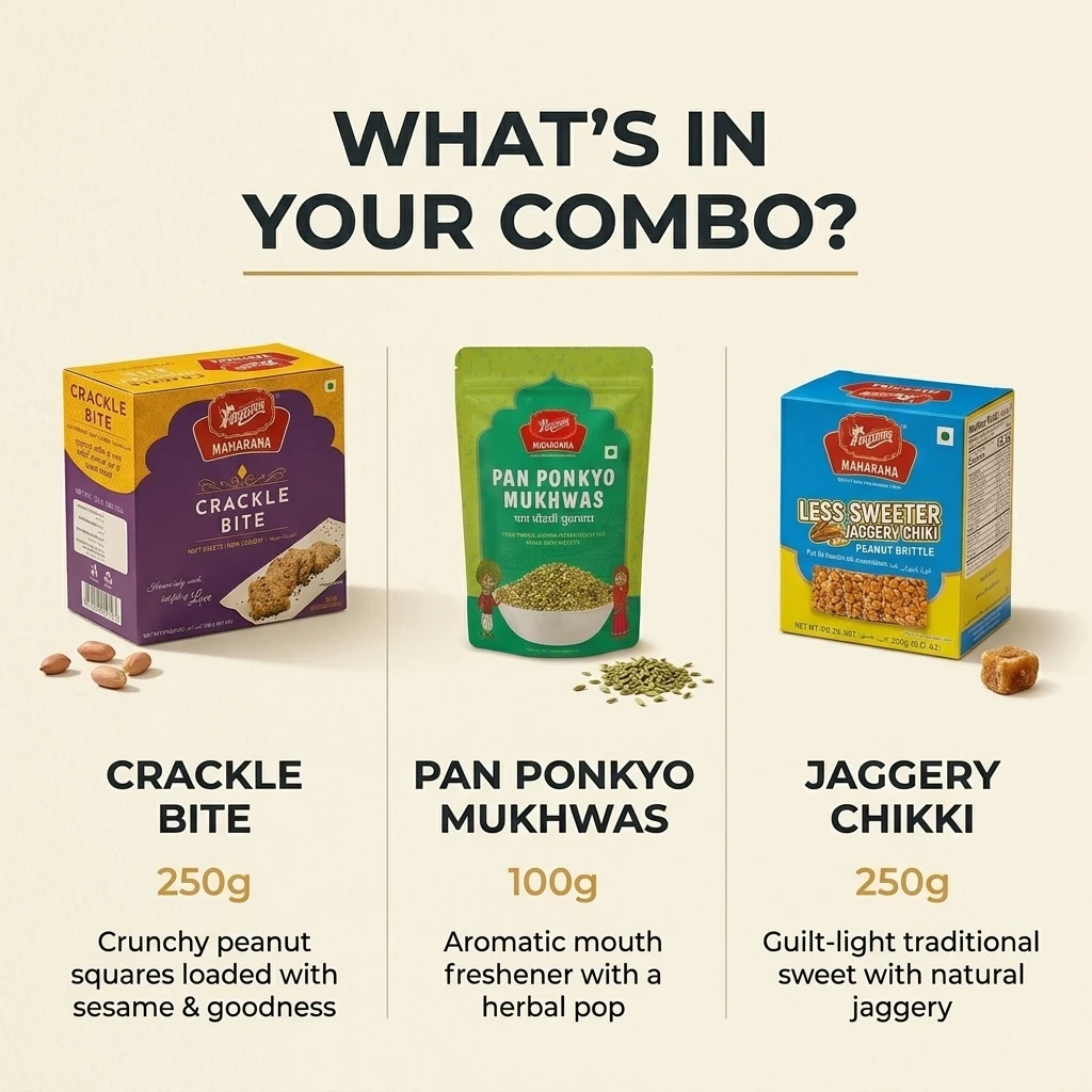 The combo includes crackle bite, guilt-light jaggery chikki, and aromatic pan ponkyo mukhwas, each crafted for an authentic taste experience.