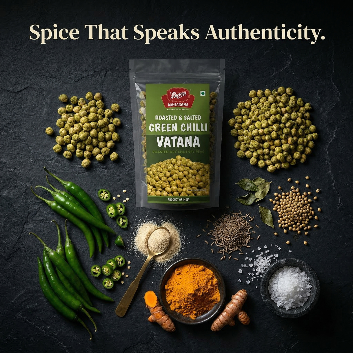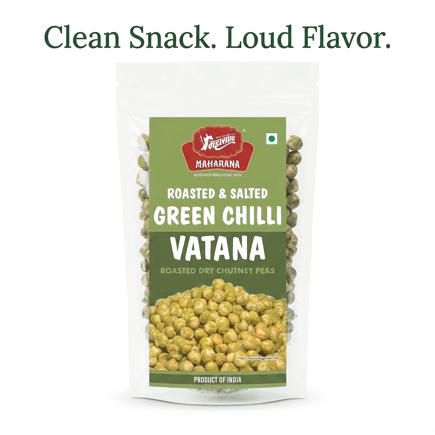 Green chilly vatana is a traditional ready-to-eat snack made from dry roasted peas (vatana) that are generously spiced with dry green chilly chutney and other seasonings. it offers a crunchy texture and a vibrant burst of flavors.