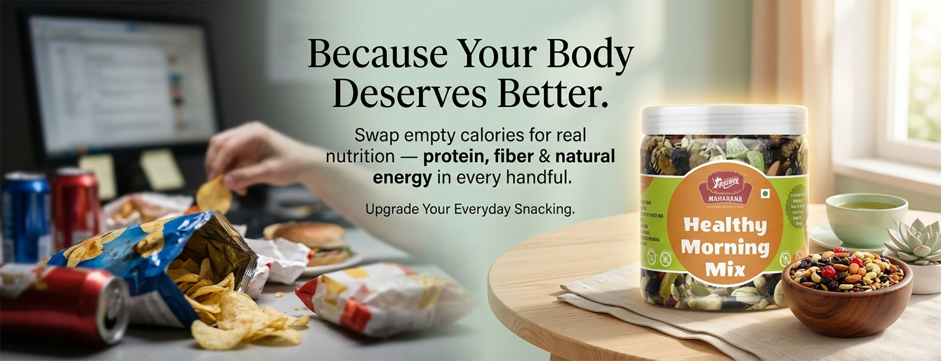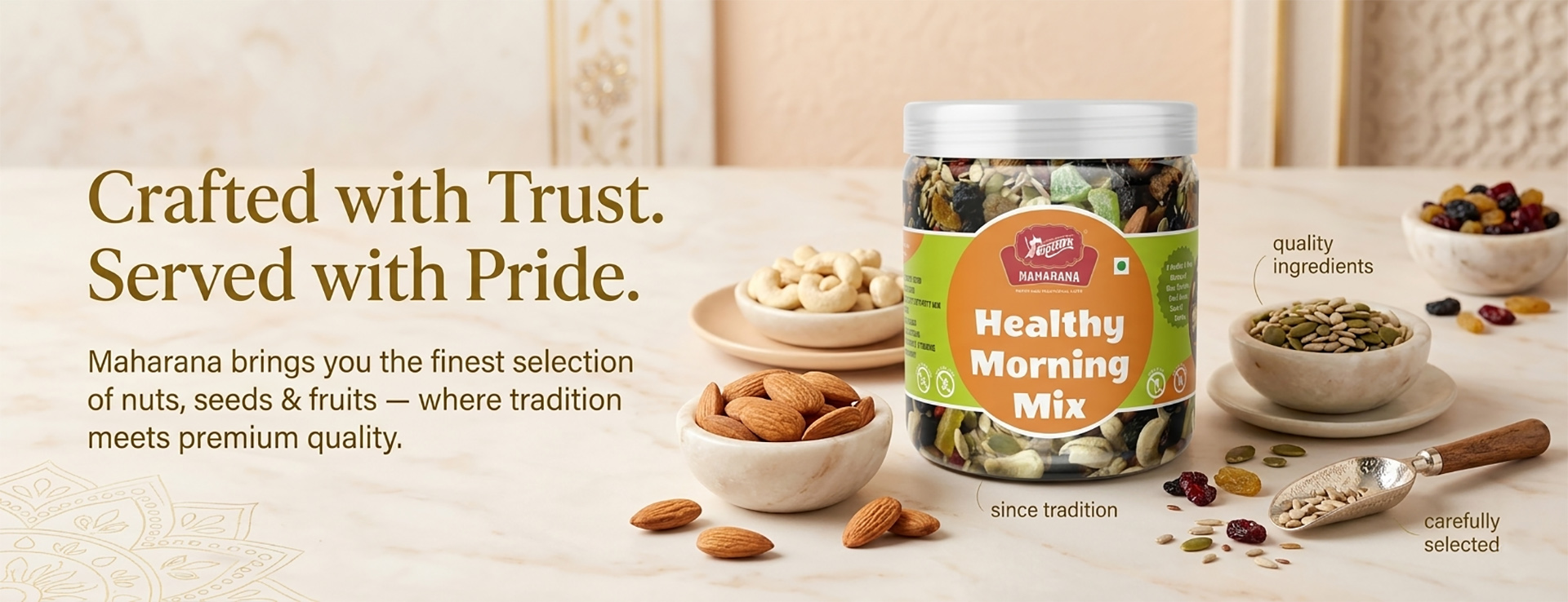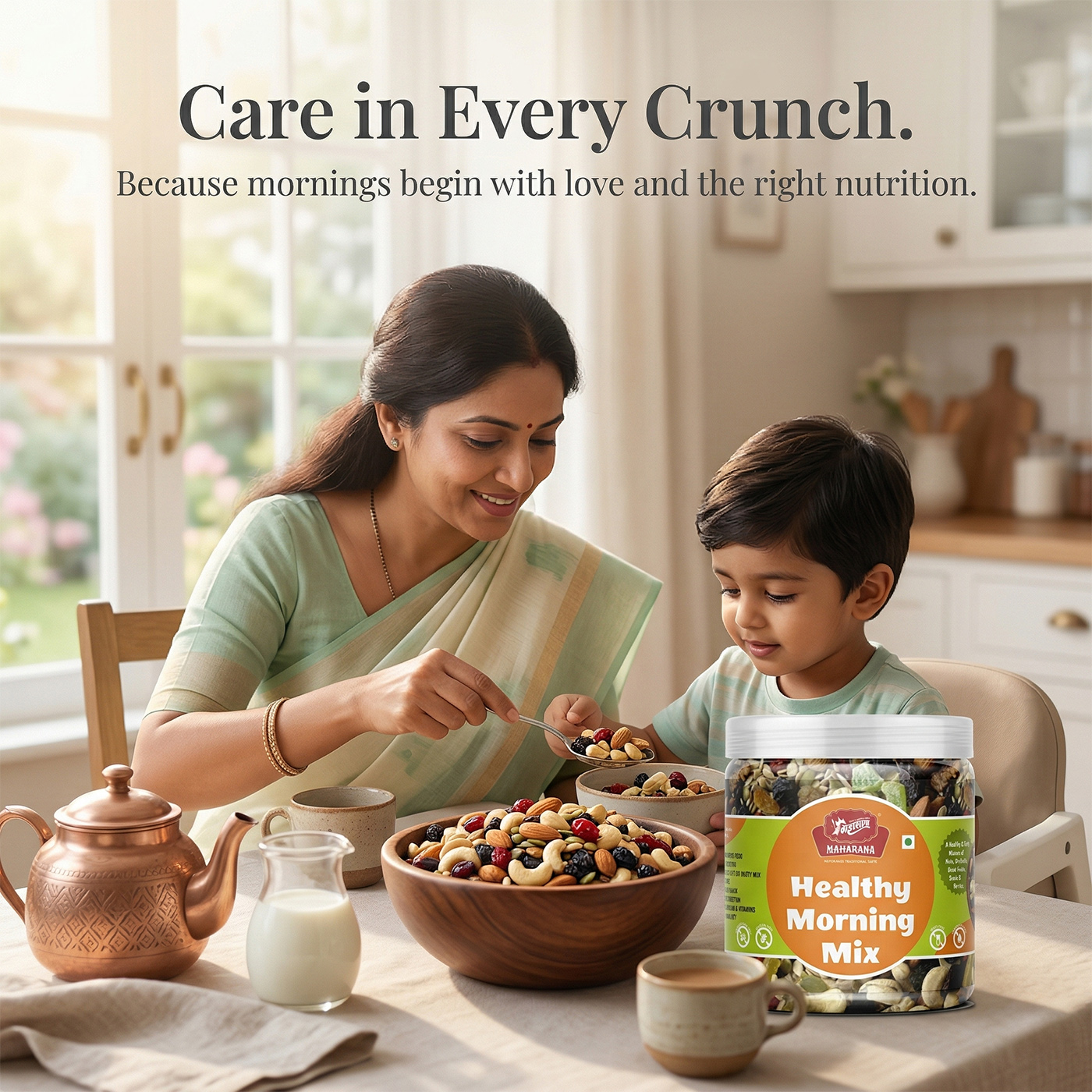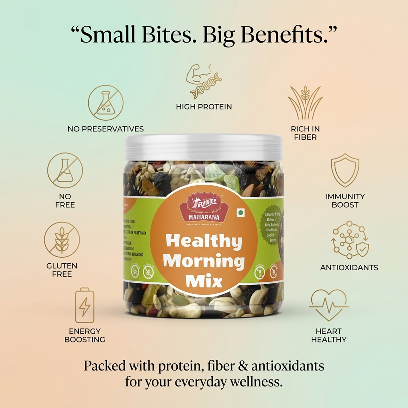 Healthy morning mix is a nutritious blend of dry fruits, essential seeds, and dehydrated berries. it is designed to provide a rich source of vitamins, fiber, iron, and proteins suitable for all age groups.