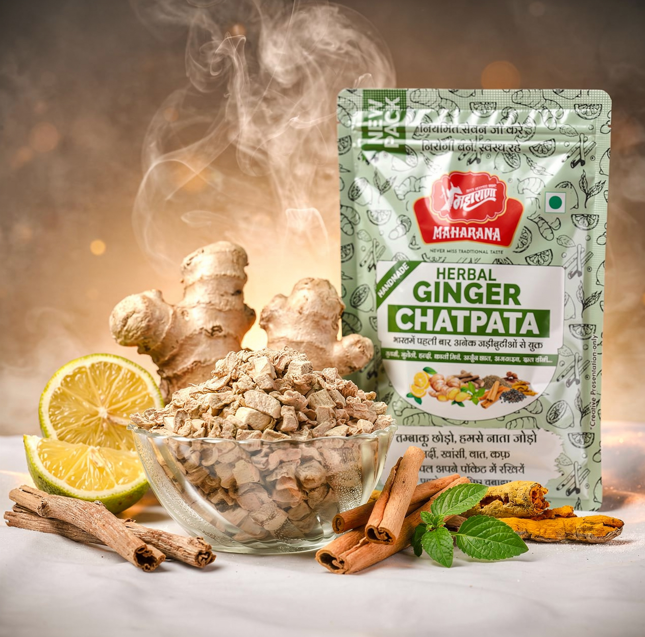 Herbal ginger chatpata is an ayurvedic digestive aid made from premium herbal ingredients including ginger, tulsi, jethimadh, turmeric, black pepper, arjunchhal, and ajwain. it is designed to support digestion and boost immunity.
