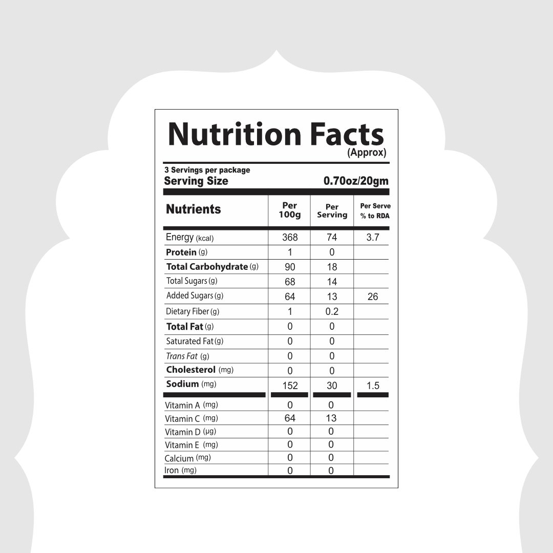 The main ingredients include sugar, lemon powder (citric acid), salt, roasted cumin powder, black salt, natural lemon flavor, and an anti-caking agent.