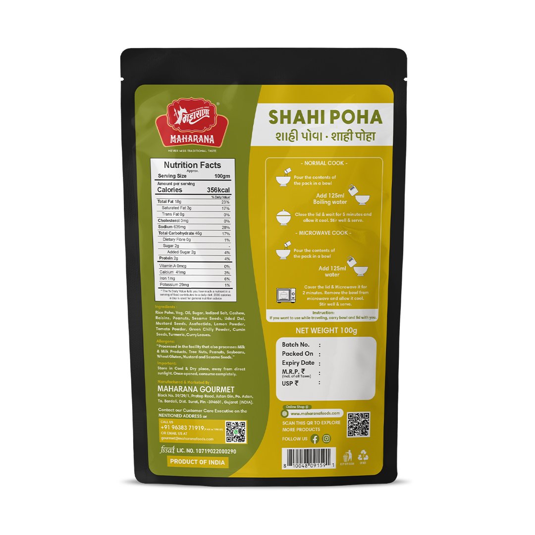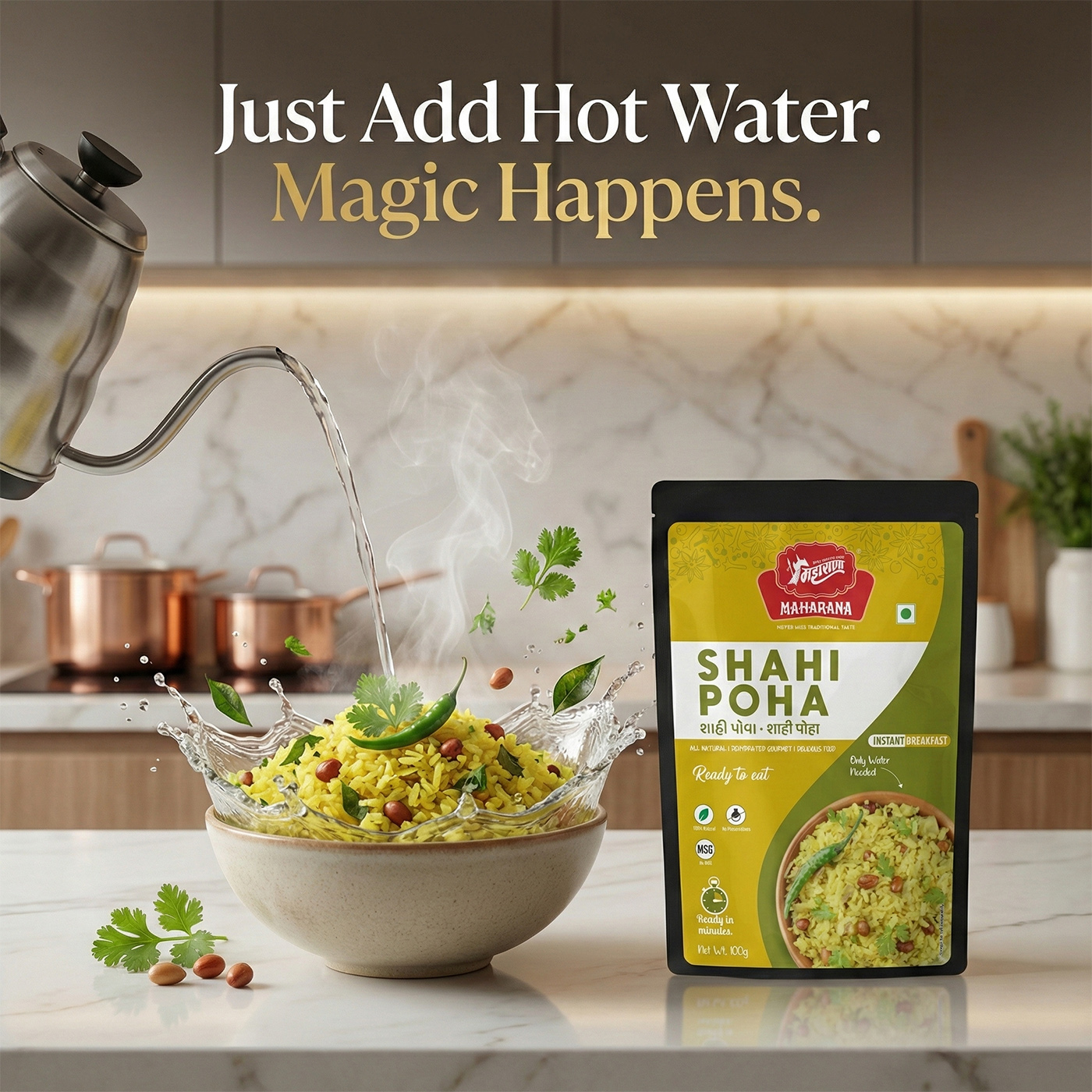 Maharana instant shahi poha is a ready-to-eat flattened rice breakfast meal inspired by traditional western indian recipes, made with natural ingredients and designed for quick preparation.