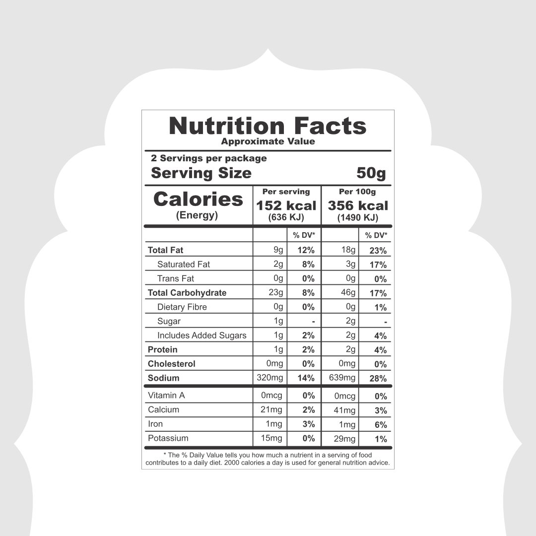 The main ingredients include flattened rice (poha), dehydrated vegetables, traditional spice mix, salt, and lemon powder with no artificial flavours, colours, or preservatives.