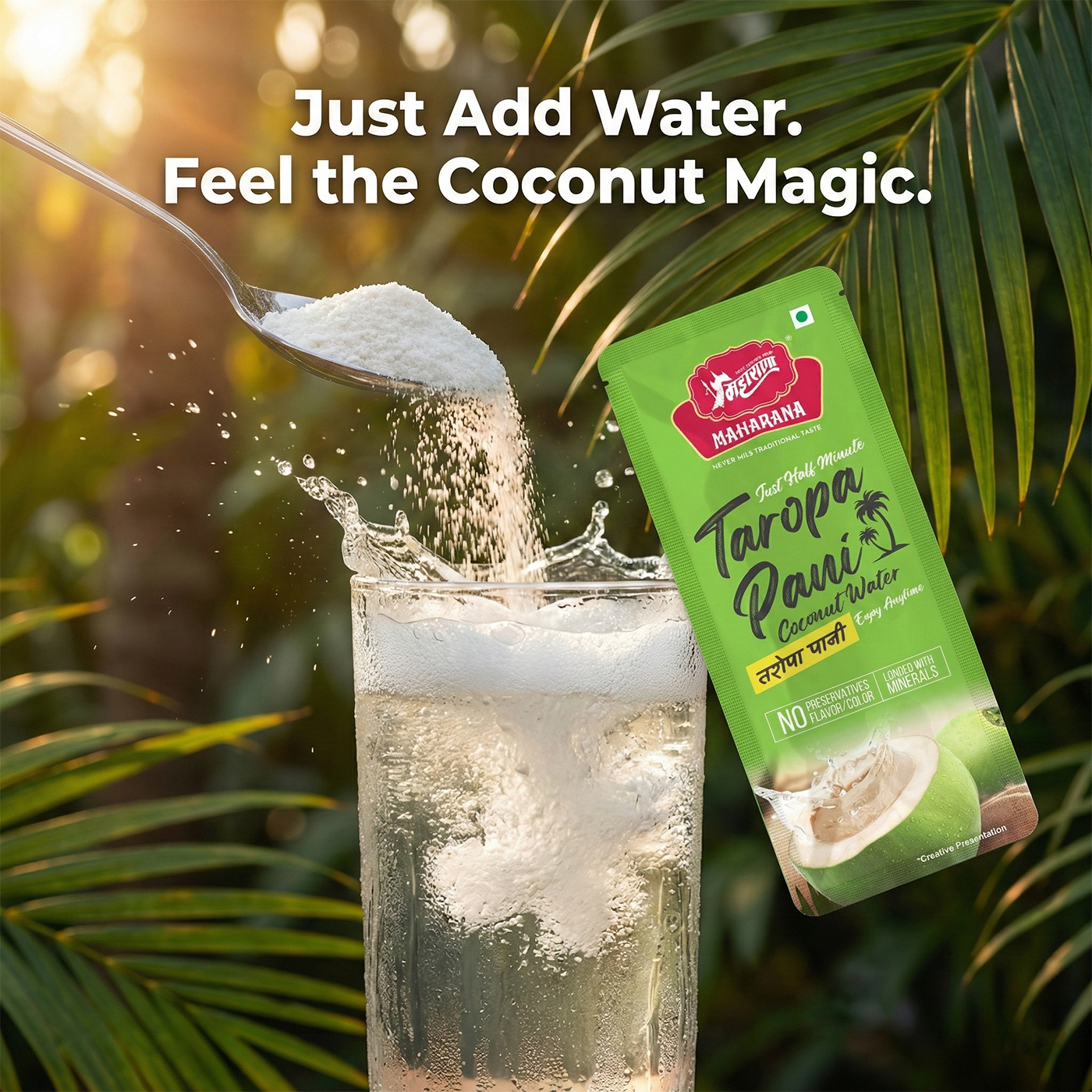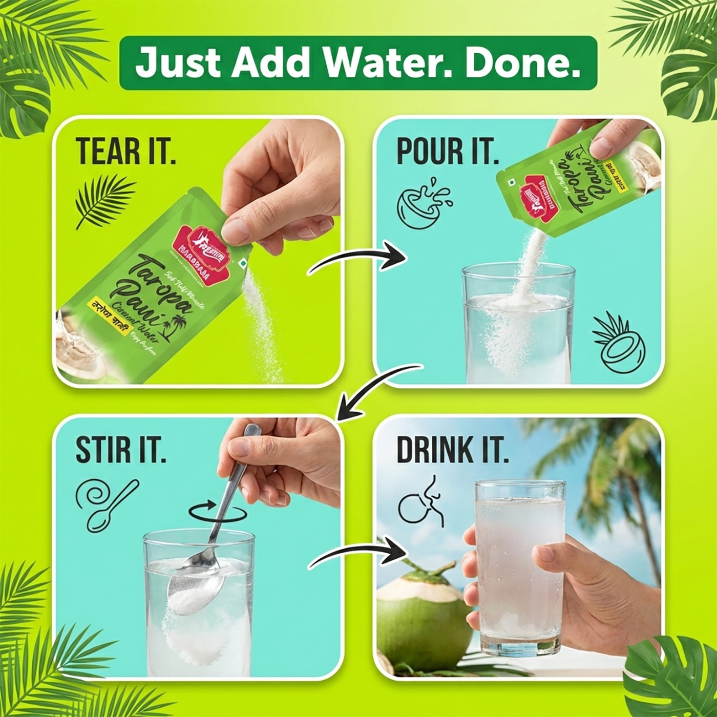 Instant taropa pani is a powdered coconut water mix that can be reconstituted with water to provide natural coconut water nutrition anytime.