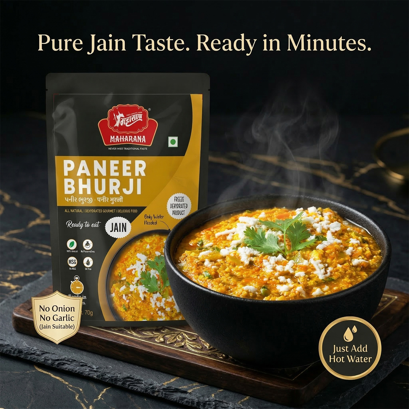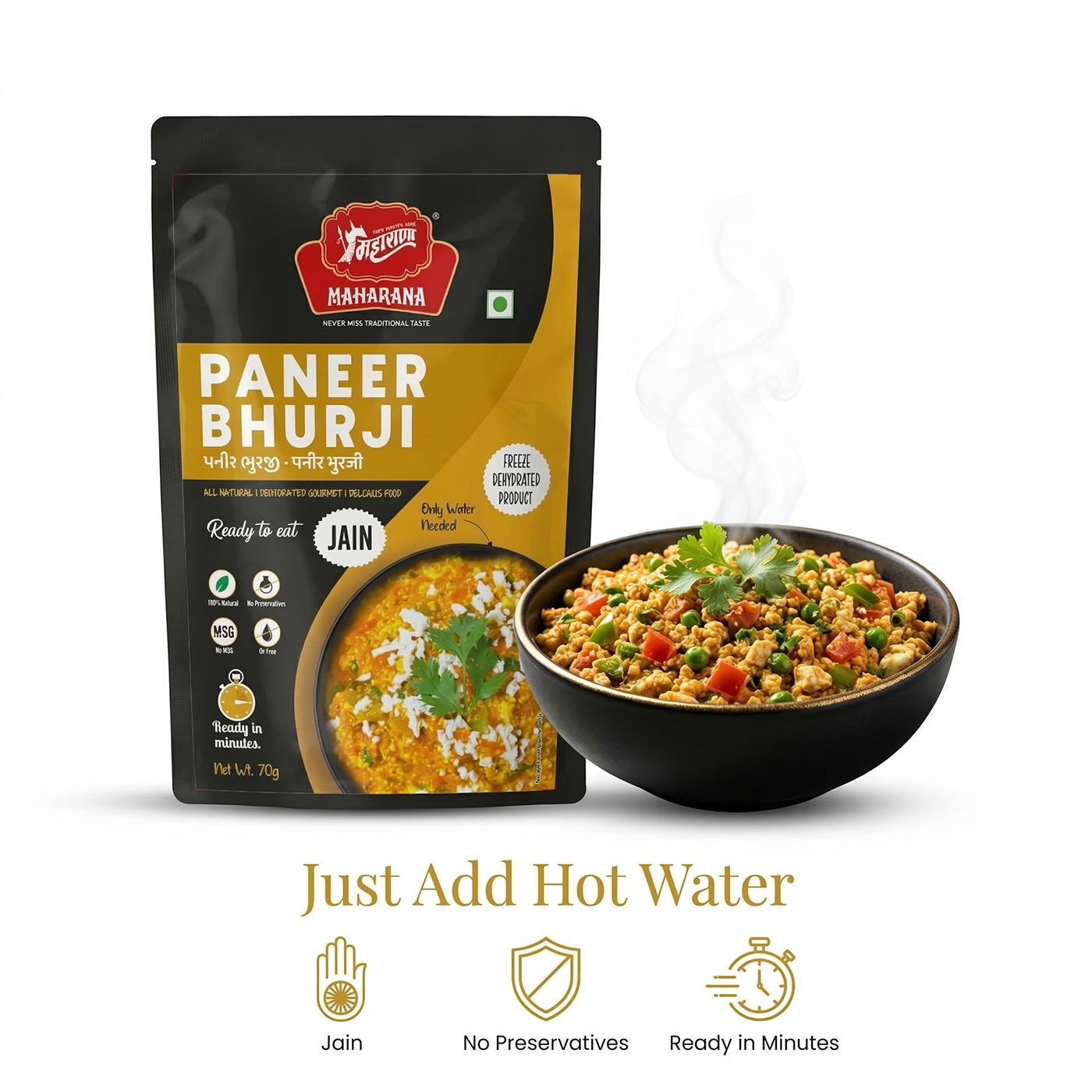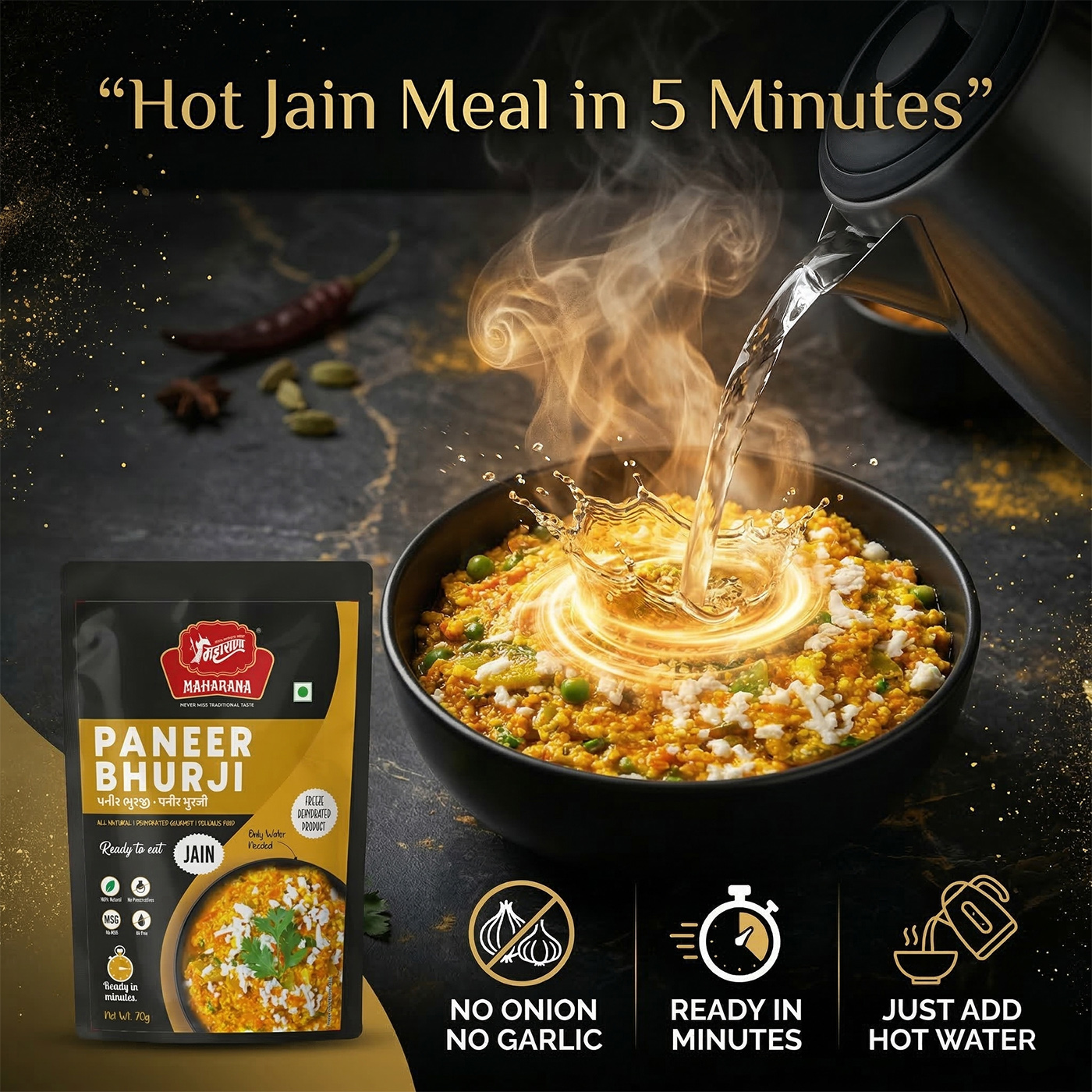 Jain paneer bhurji is a ready to eat north indian dish made with indian cottage cheese called paneer, herbs, and ground spices. it is inspired by traditional recipes and requires minimal preparation.