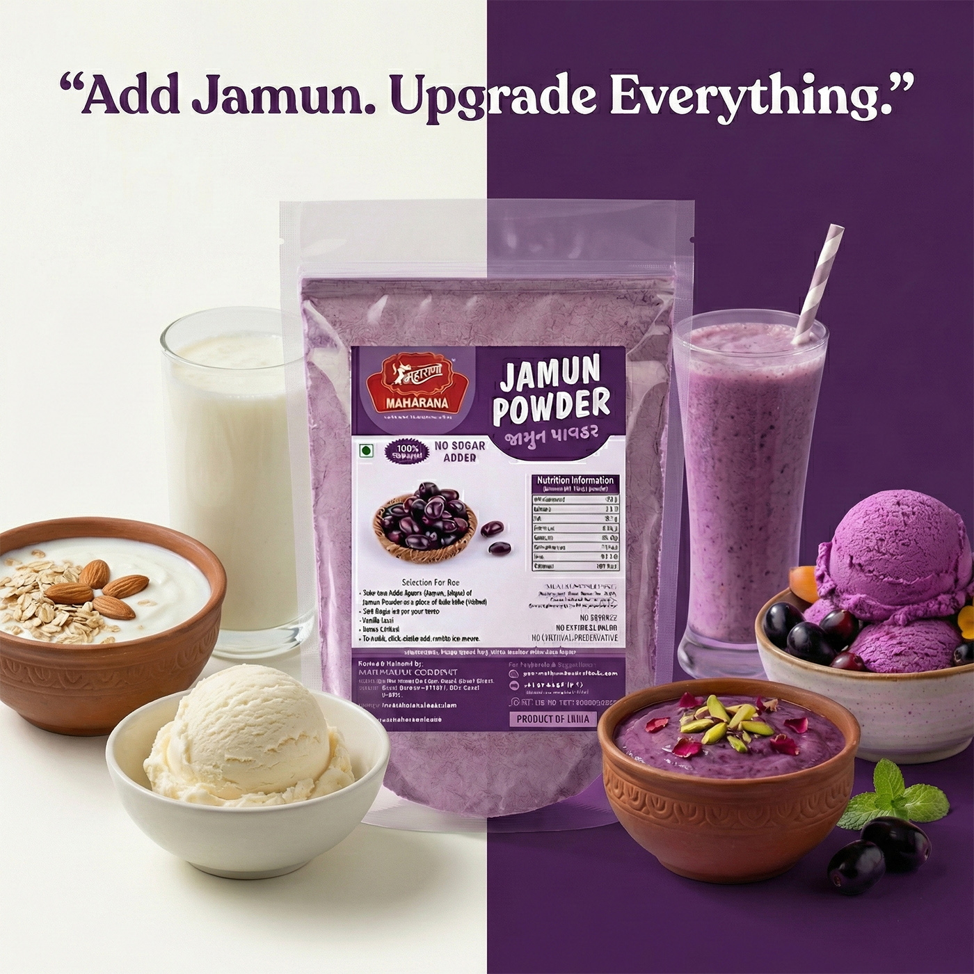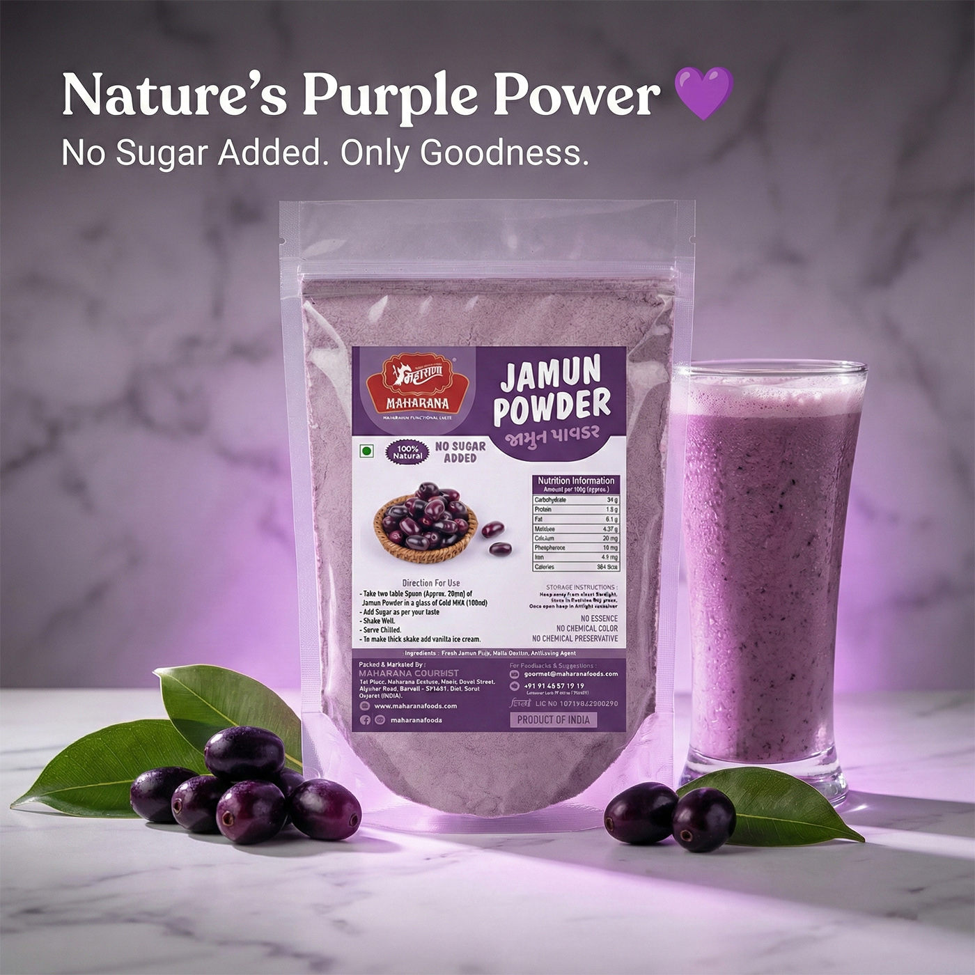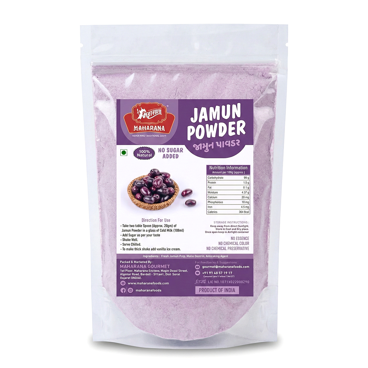 It consists of 100% pure jamun fruit powder obtained by spray drying fresh jamun pulp, with no additives.