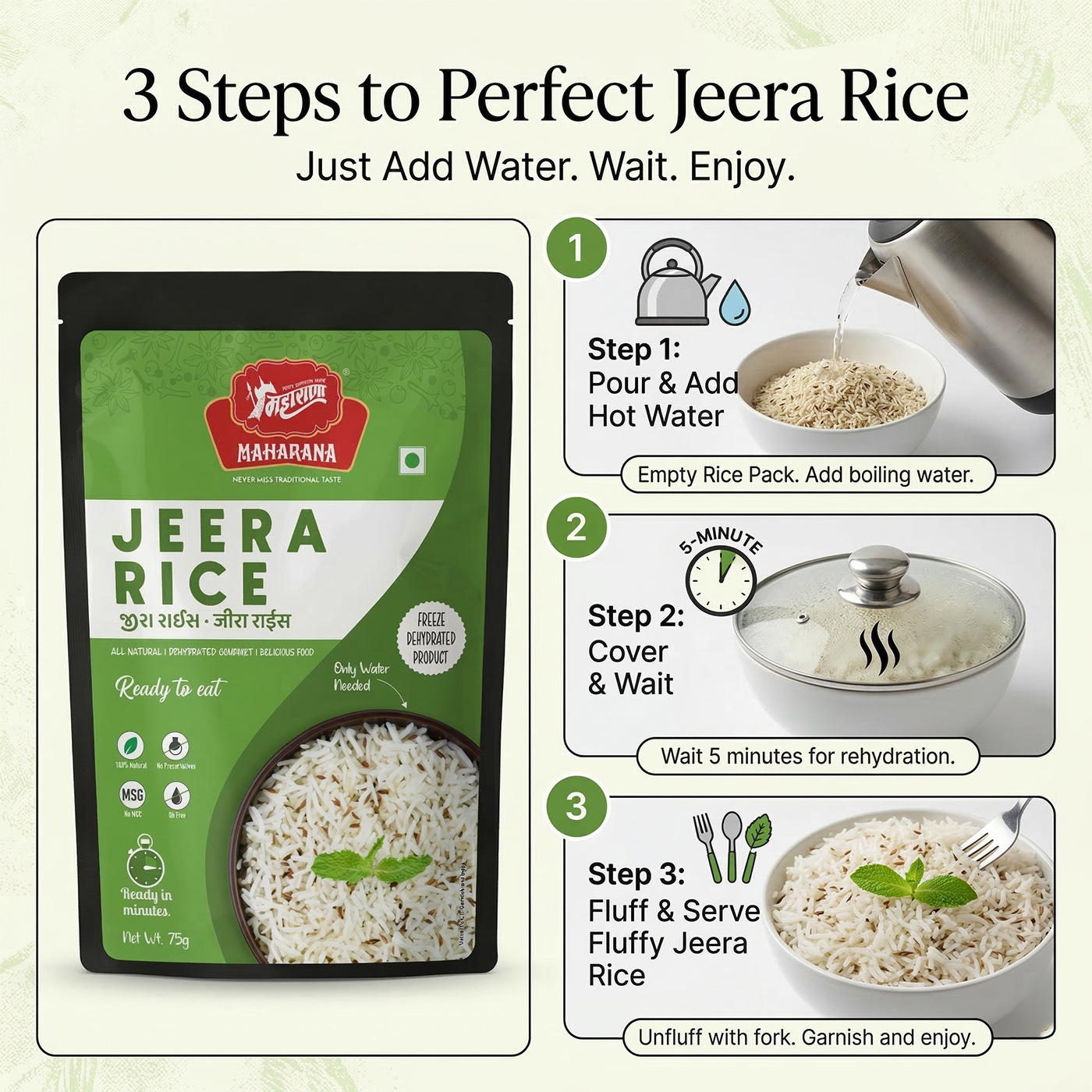 Jeera rice is a popular indian dish made from cooked basmati rice and roasted cumin seeds, seasoned with natural spices and iodized salt. it is known for its aromatic flavor and is commonly eaten as an everyday rice dish.