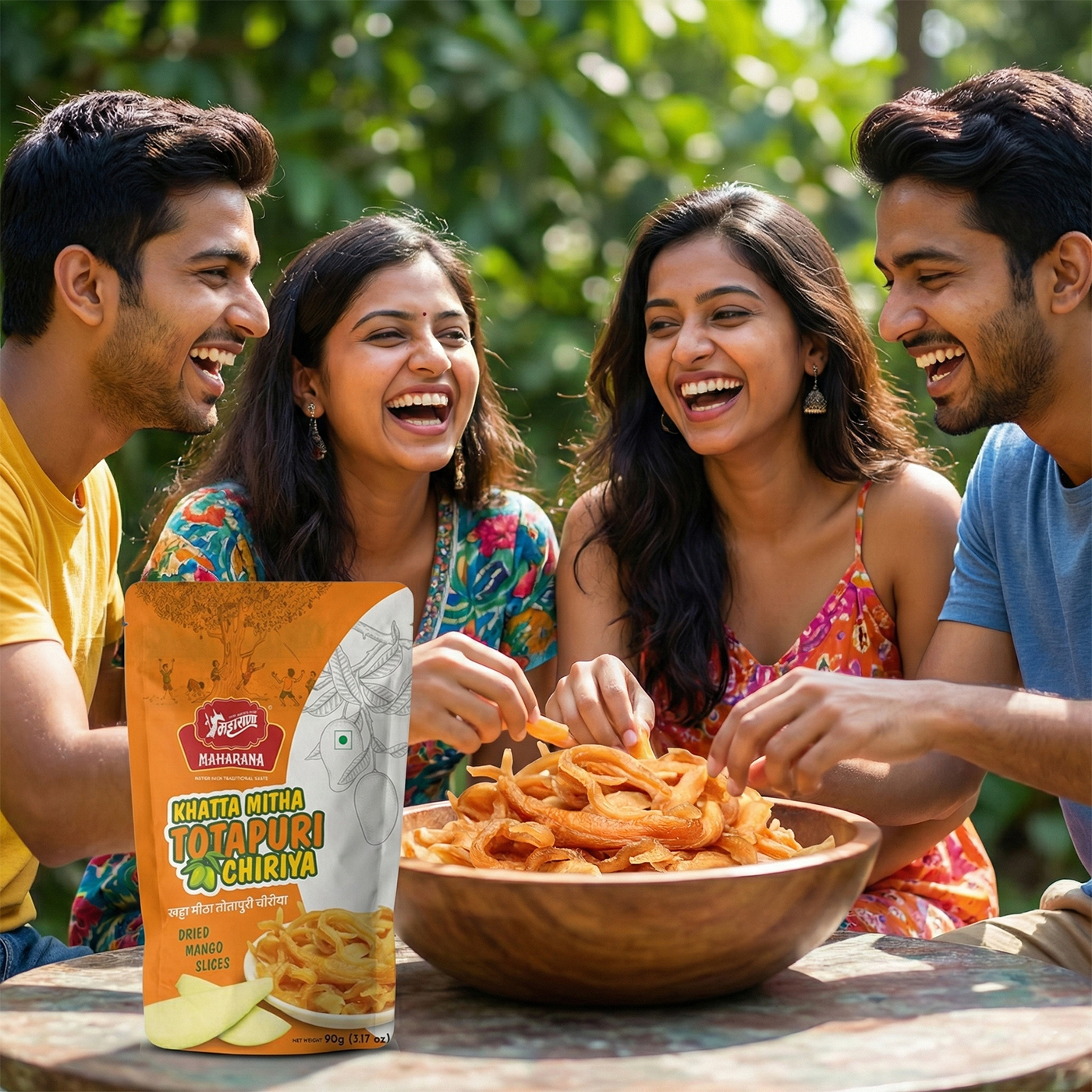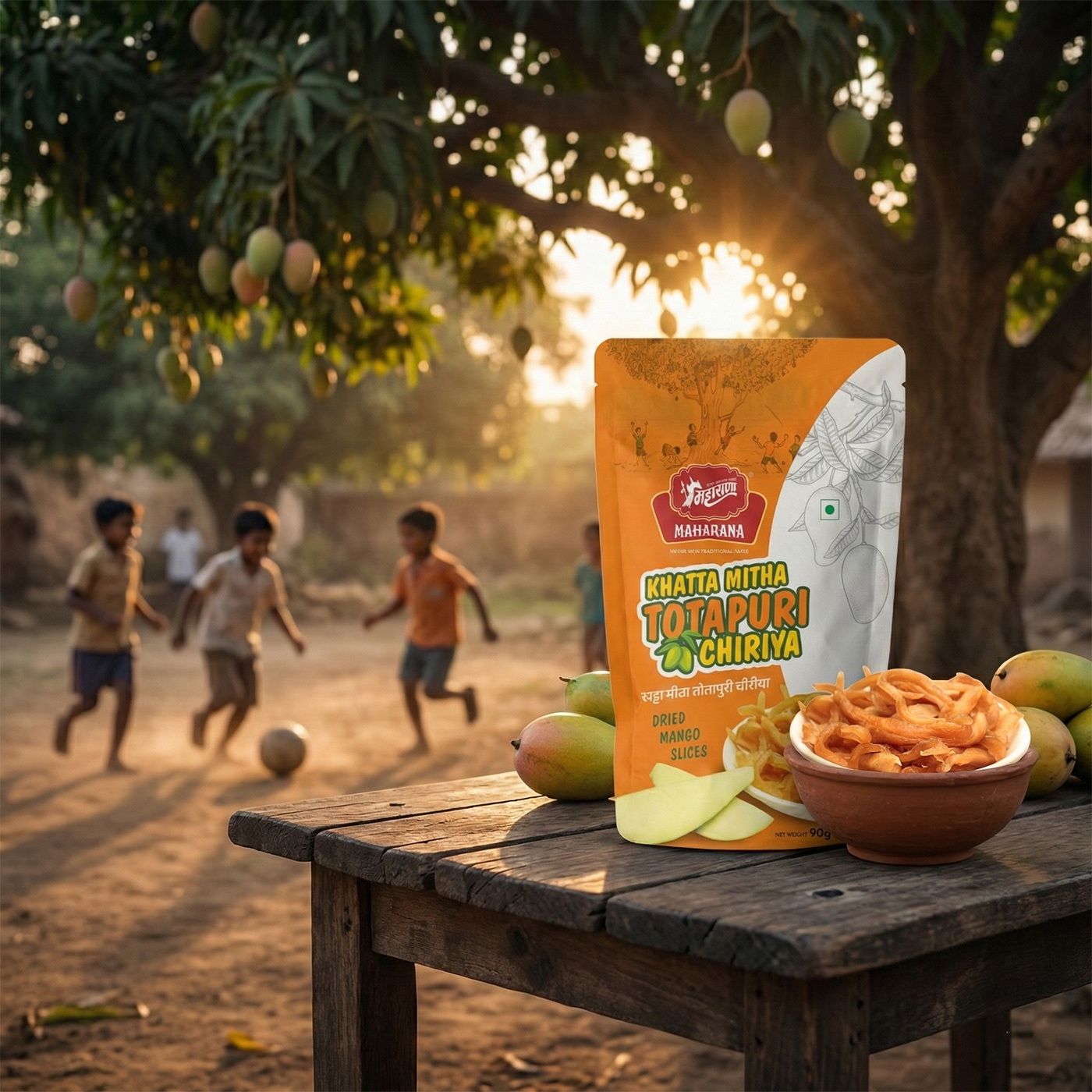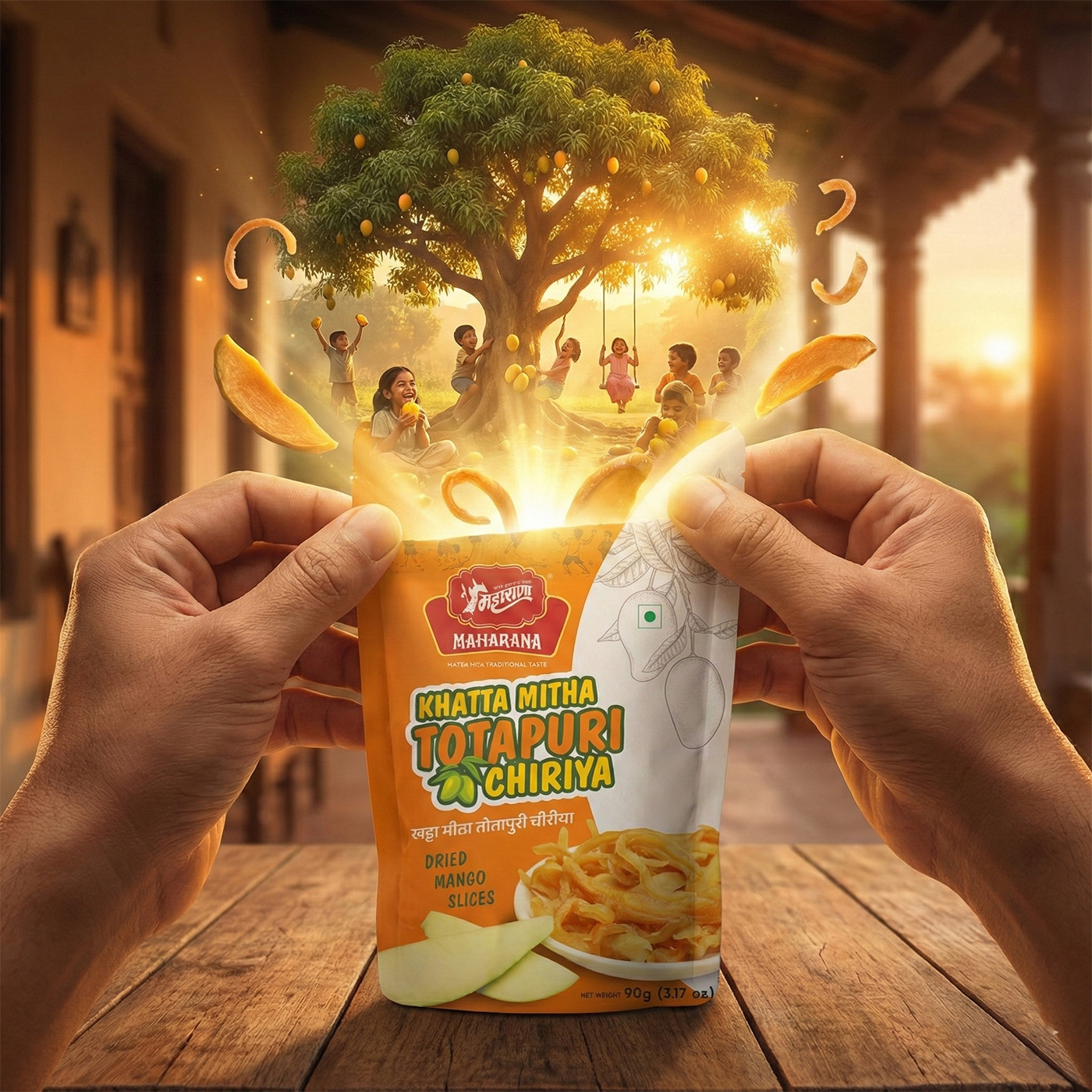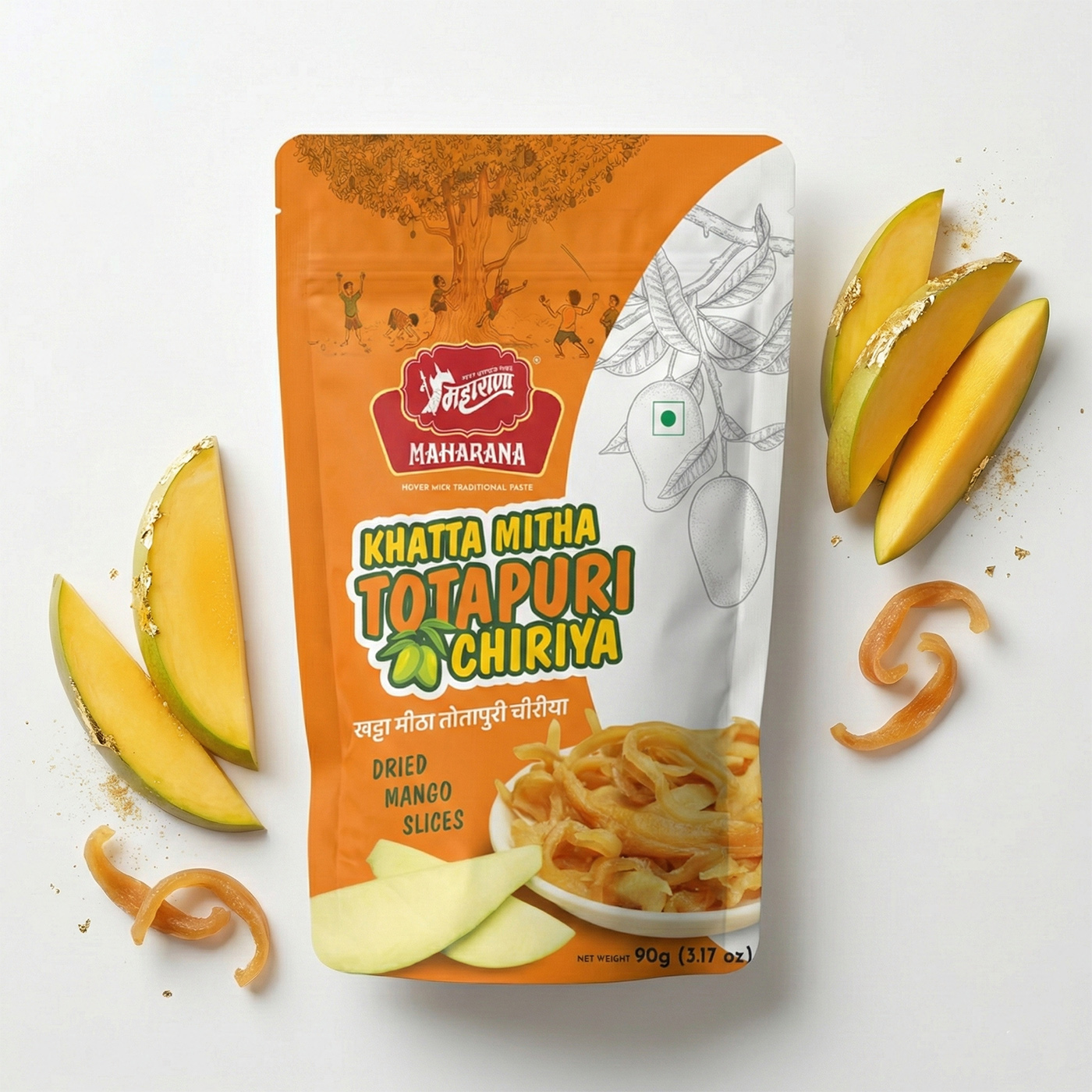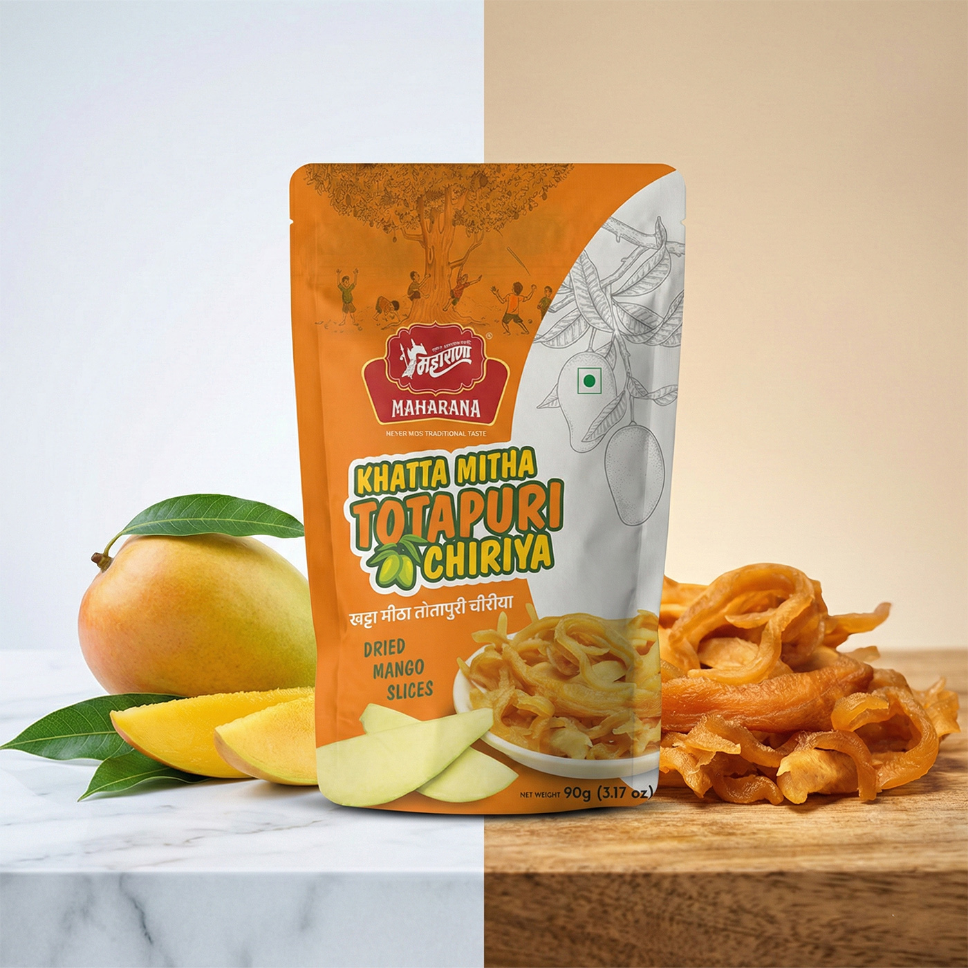 Khatta mitha totapuri chiriya is packaged and distributed by maharana foods, india.