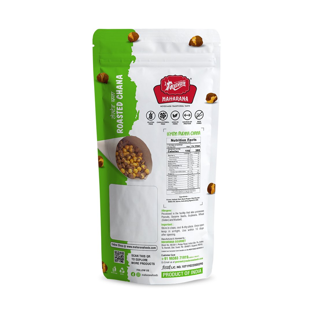 Lemon pudina chana is a roasted flavored chana snack infused with zesty lemon and mint flavors, offering a fresh and tangy taste sensation.