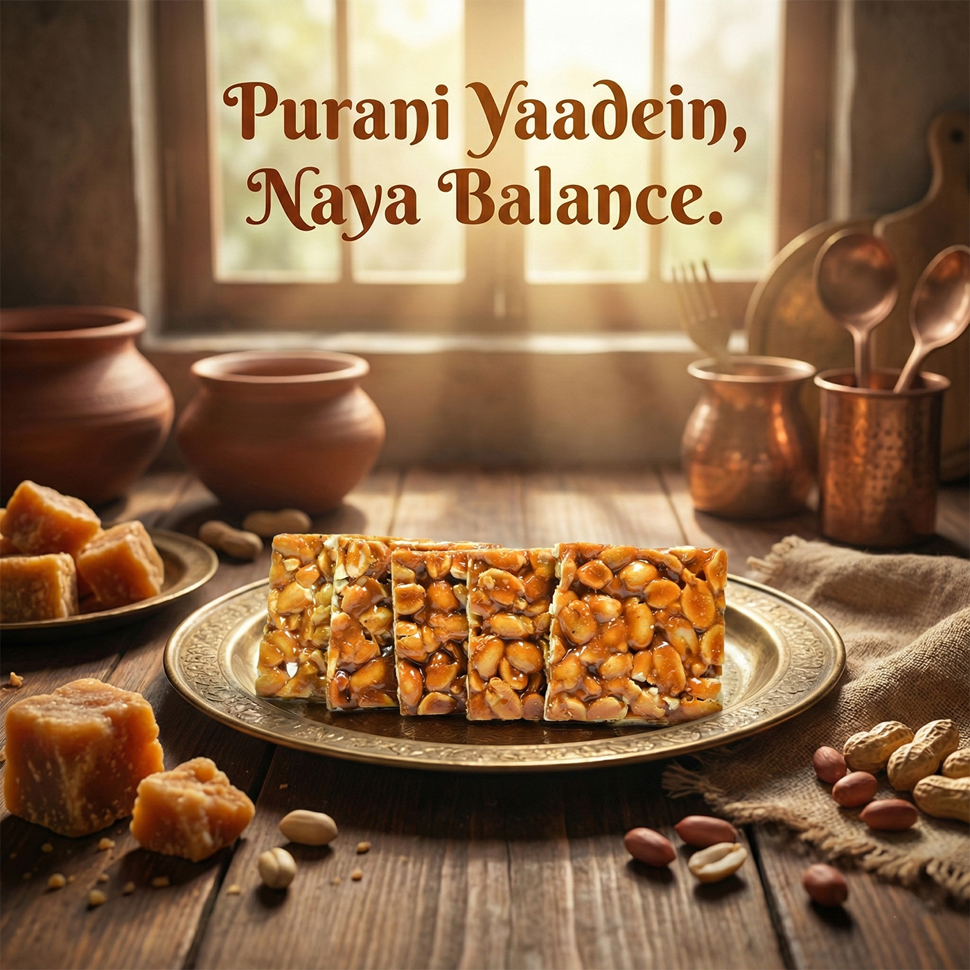Less sweeter jaggery chikki is a traditional indian snack made with roasted peanuts and natural jaggery. it is a less sweet, crunchy treat perfect for snacking.