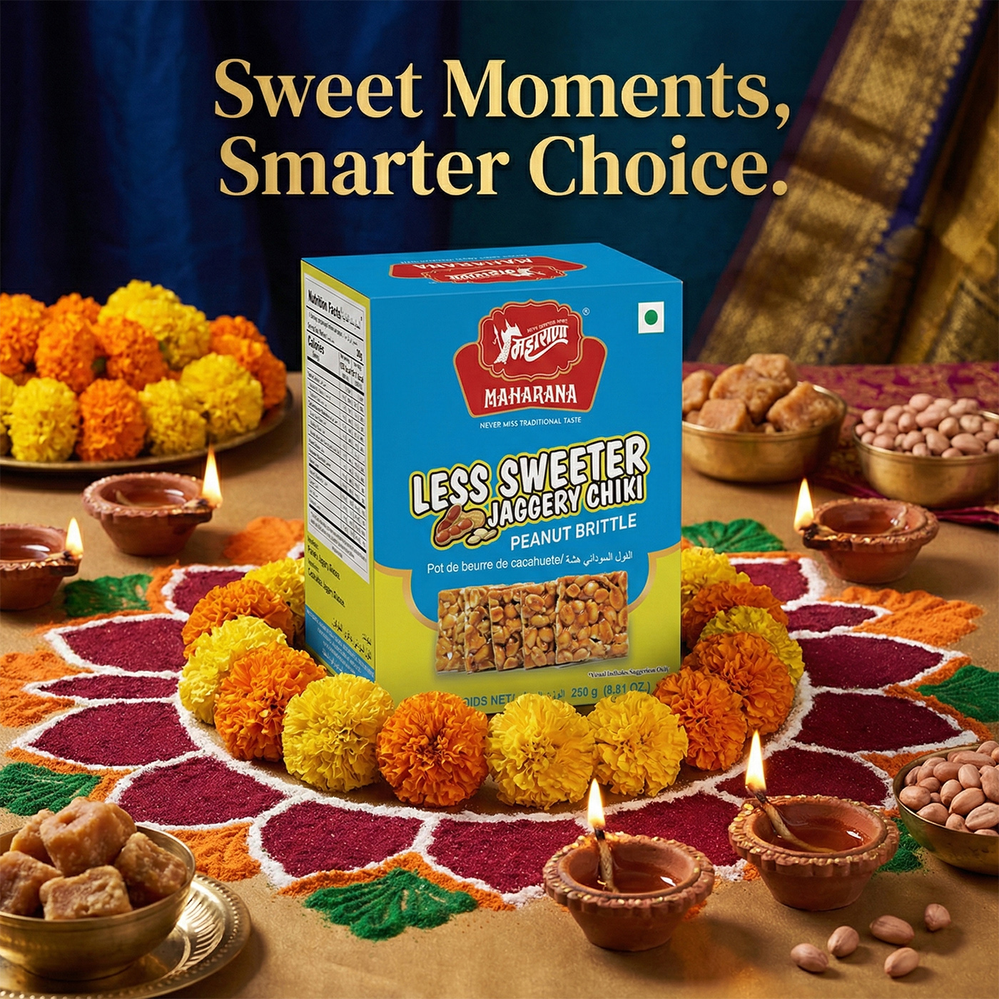 Less sweeter jaggery chikki contains peanuts and is manufactured in a facility that handles tree nuts and sesame, so people with allergies should exercise caution.