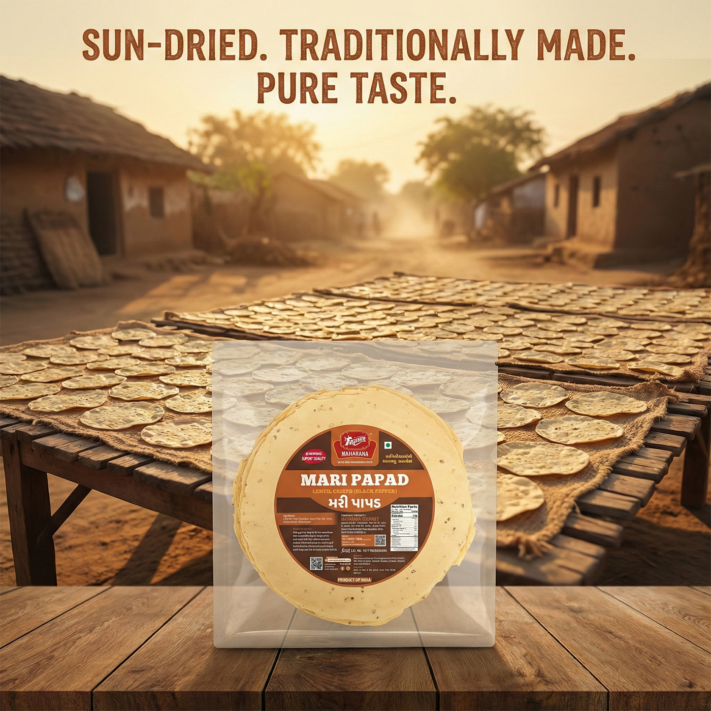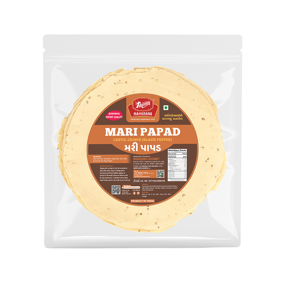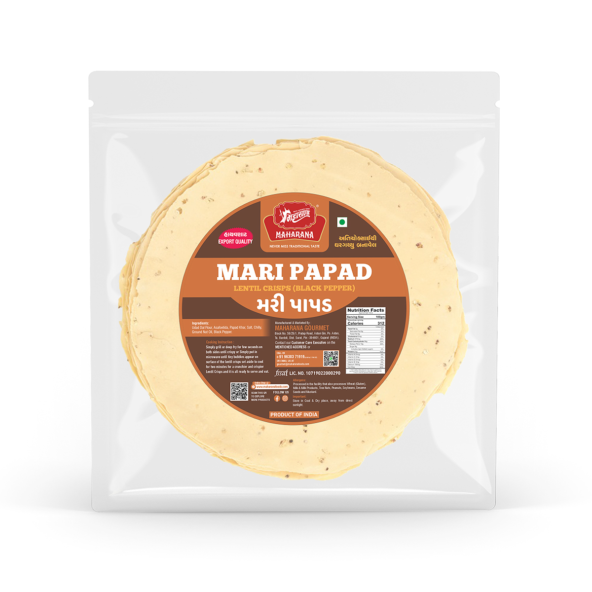 Mari papad is a thin, crisp disc-shaped indian food made primarily from black gram (urad flour) and black pepper (mari), seasoned with traditional spices.