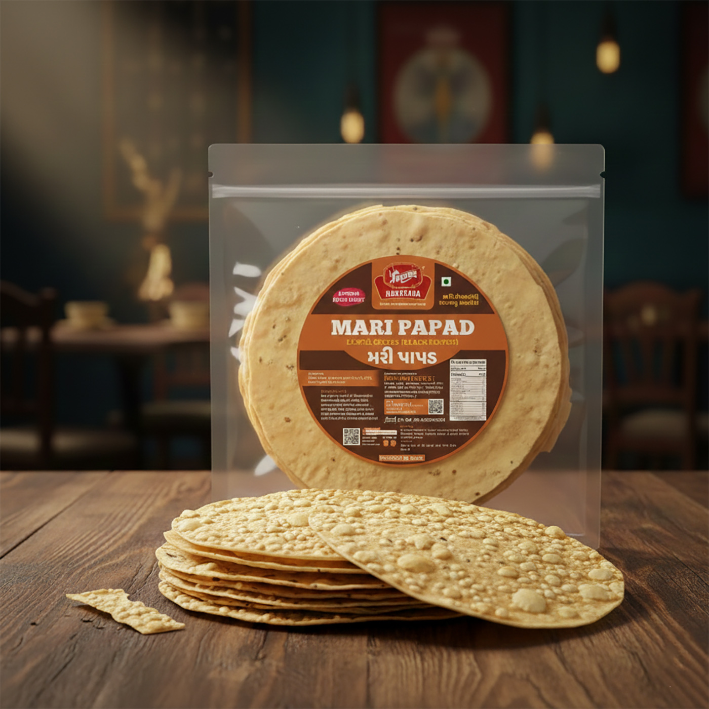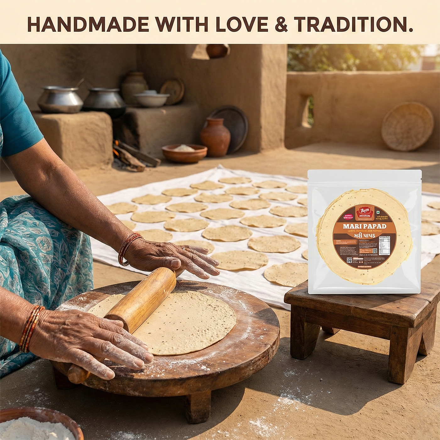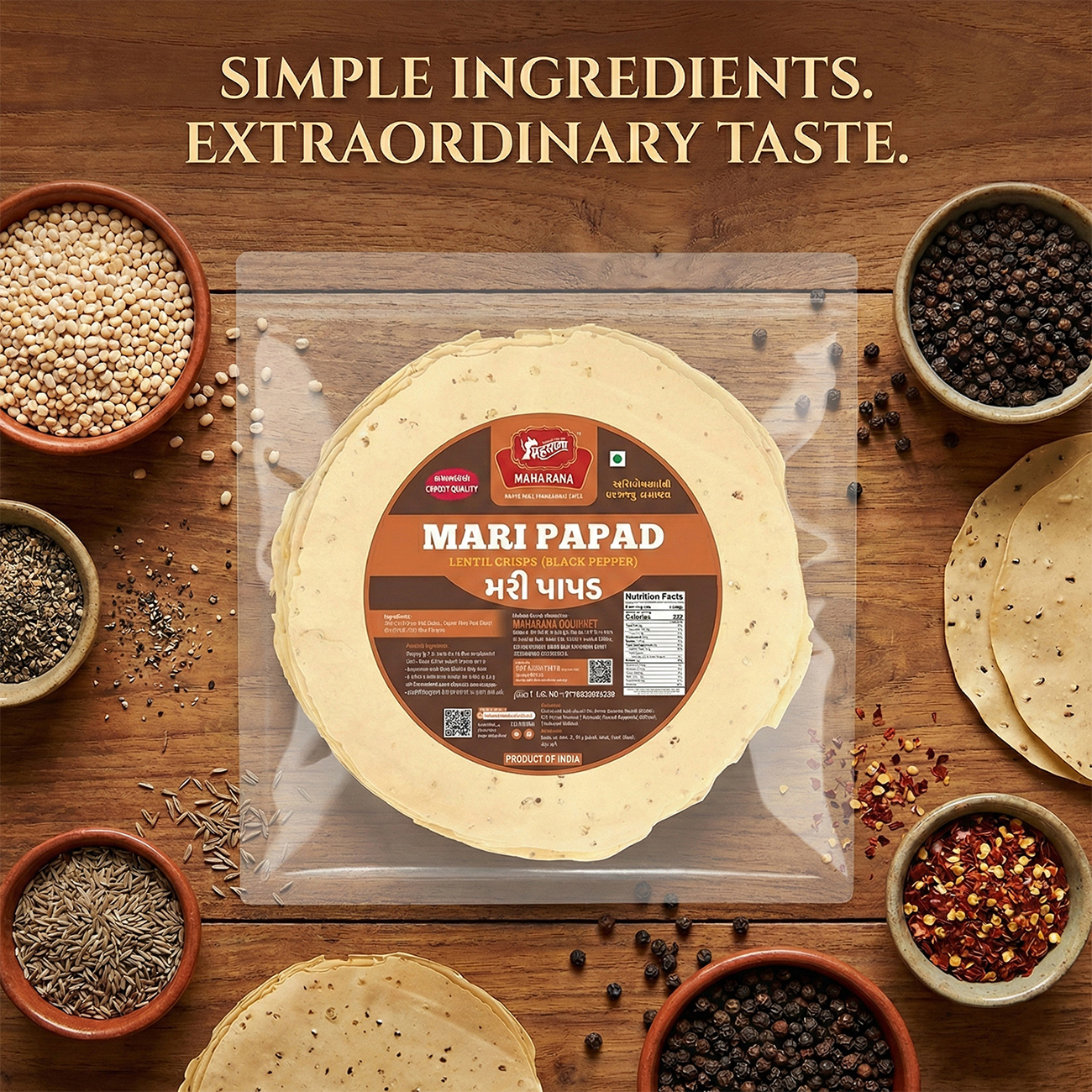 Mari papad is a thin, crisp disc-shaped indian food made primarily from black gram (urad flour) and black pepper (mari), seasoned with traditional spices.