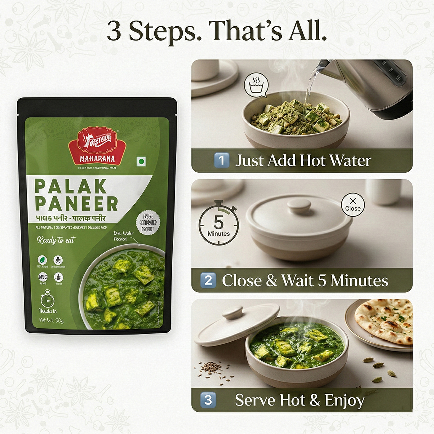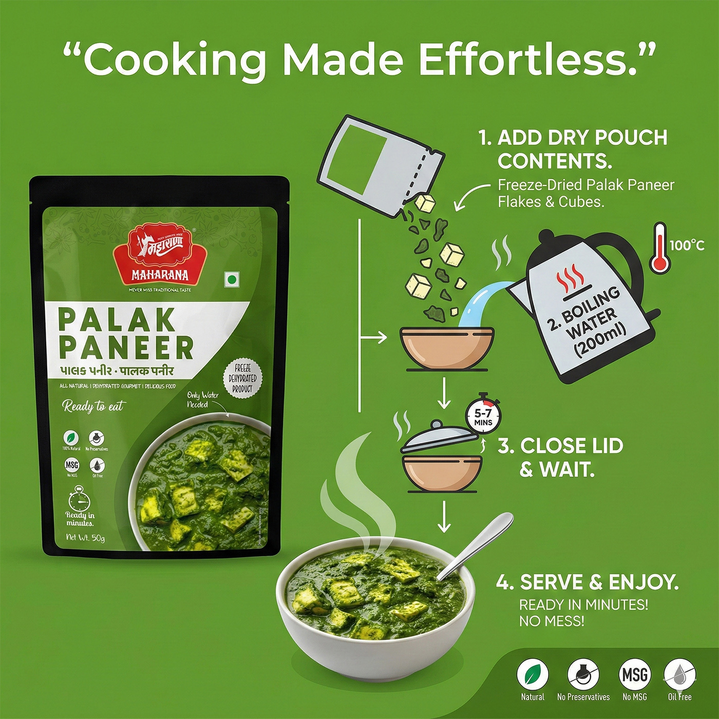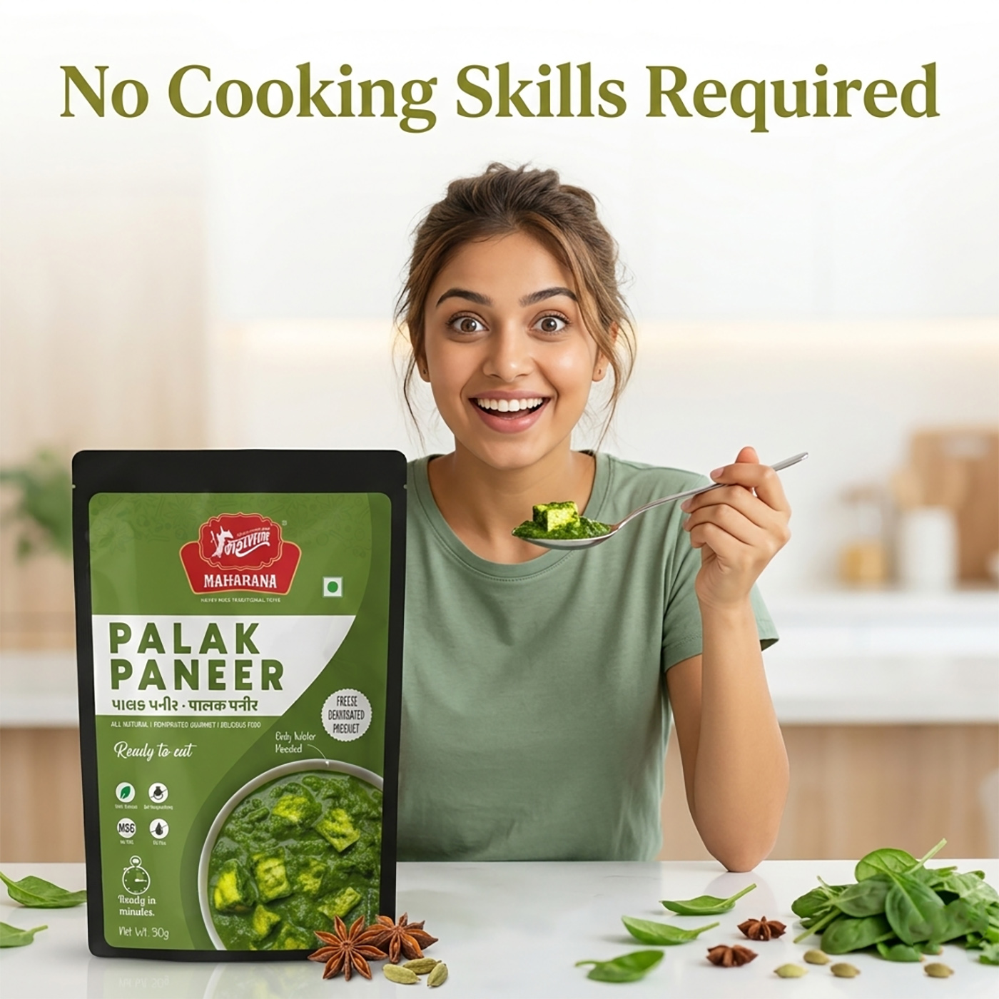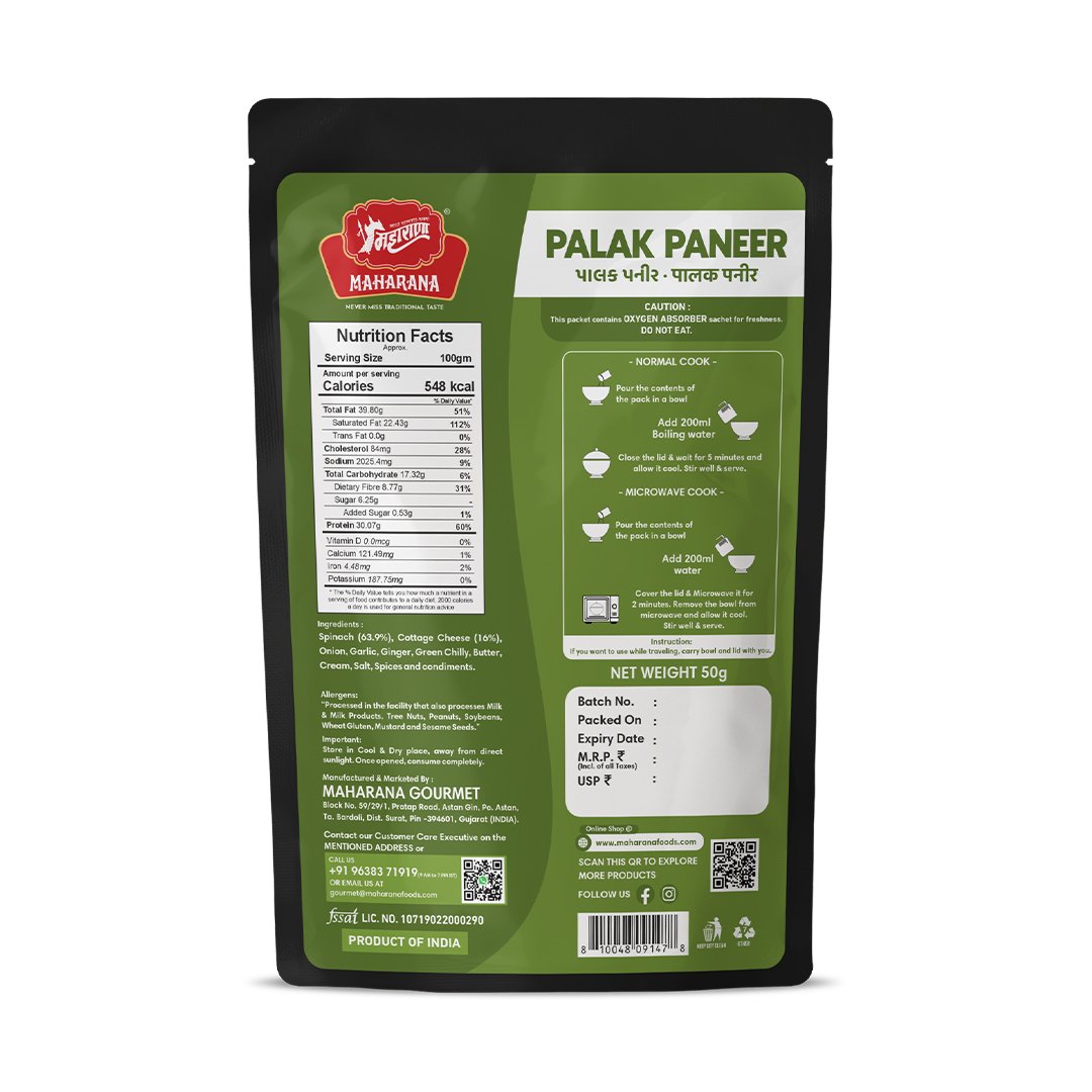 Maharana palak paneer is a ready-to-eat indian curry made with paneer (indian cottage cheese) cooked in a creamy spinach and spice gravy. it is made using premium, all-natural ingredients with no artificial flavors, colors, or preservatives.
