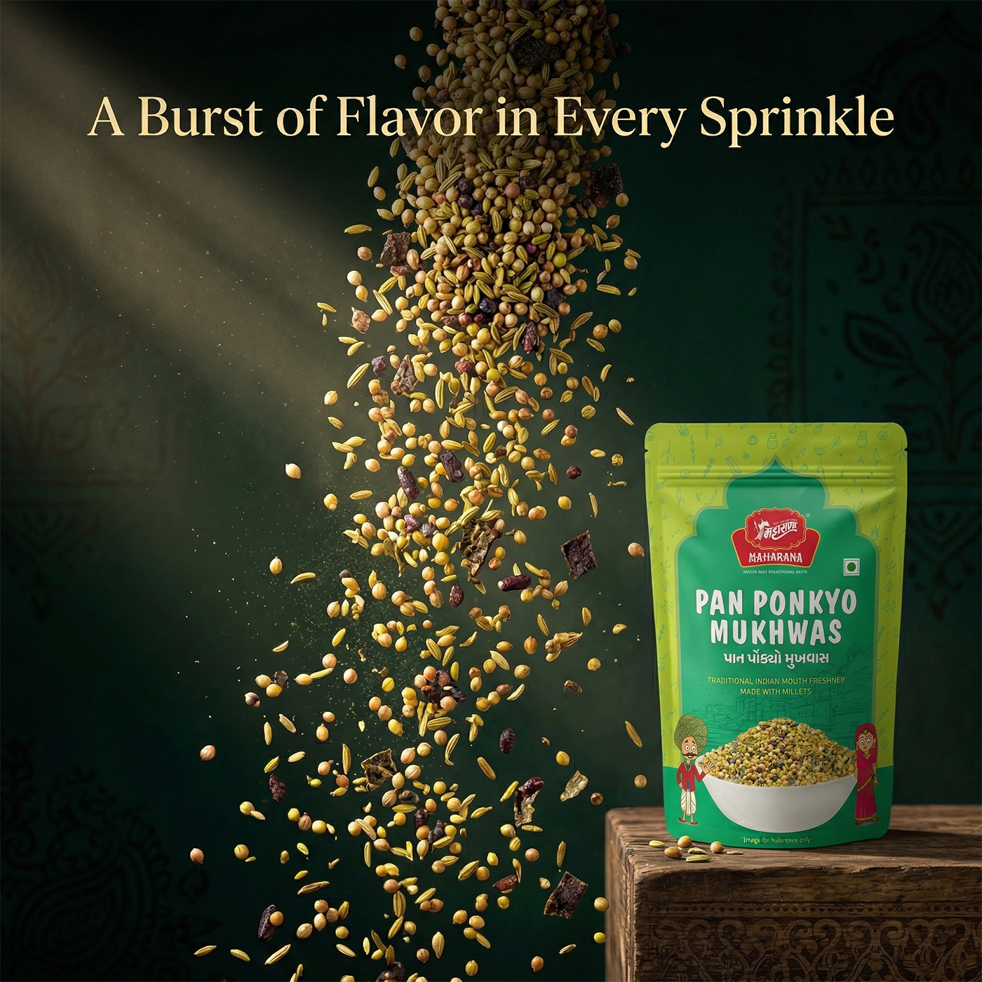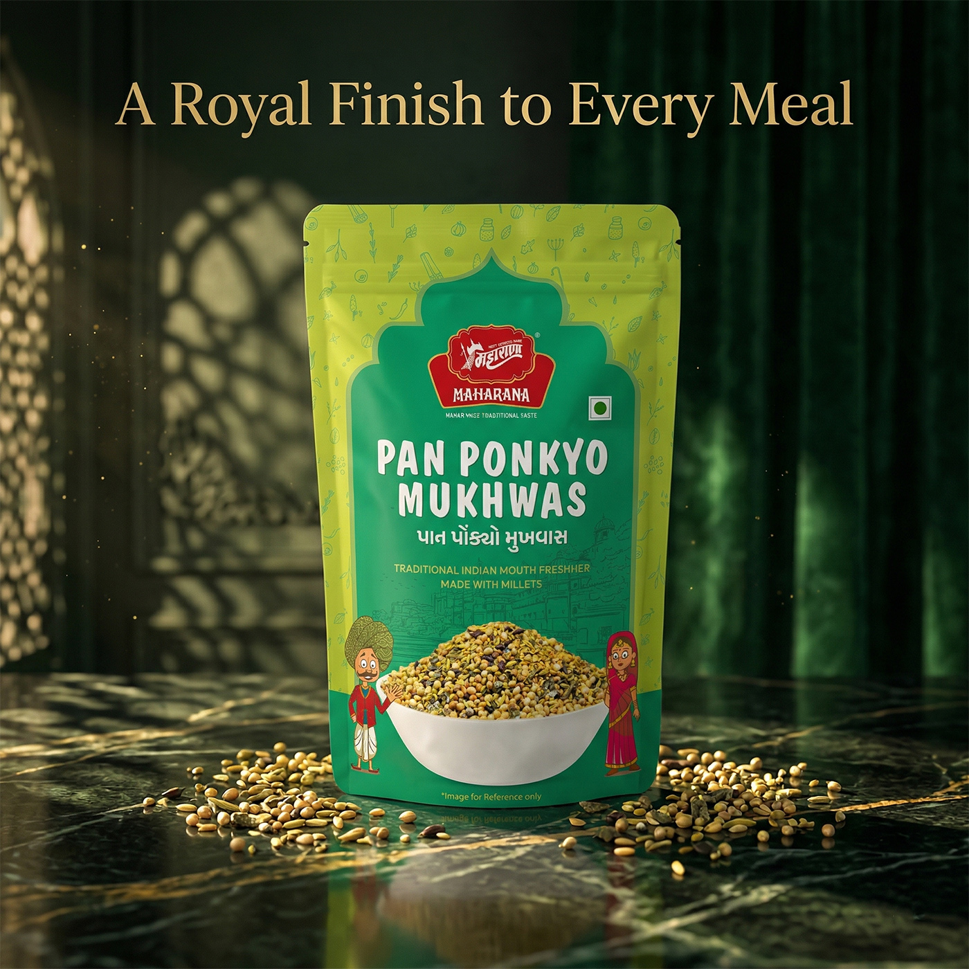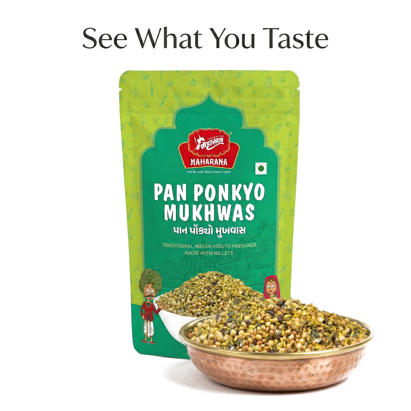 Pan ponkyo mukhwas is a traditional mouth freshener and digestive aid made from a mixer of roasted and salted fennel seeds, coriander seeds, sesame seeds, roasted jowar, and betel leaves. it is designed to refresh the breath and support digestion after meals.