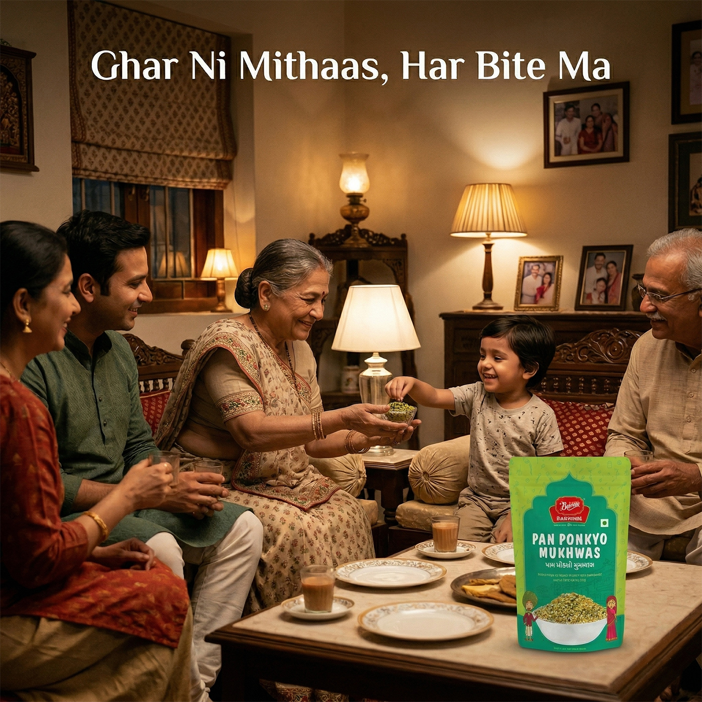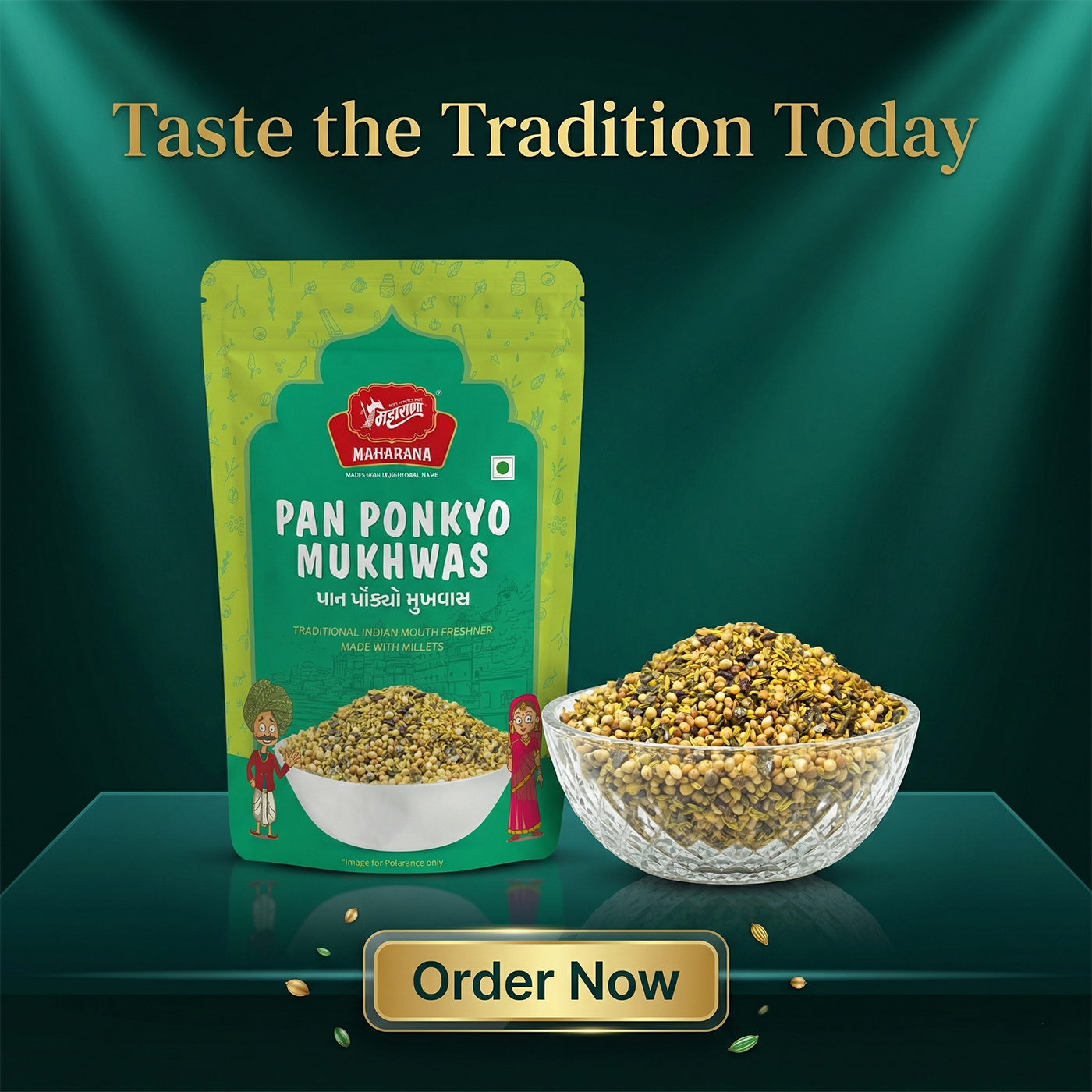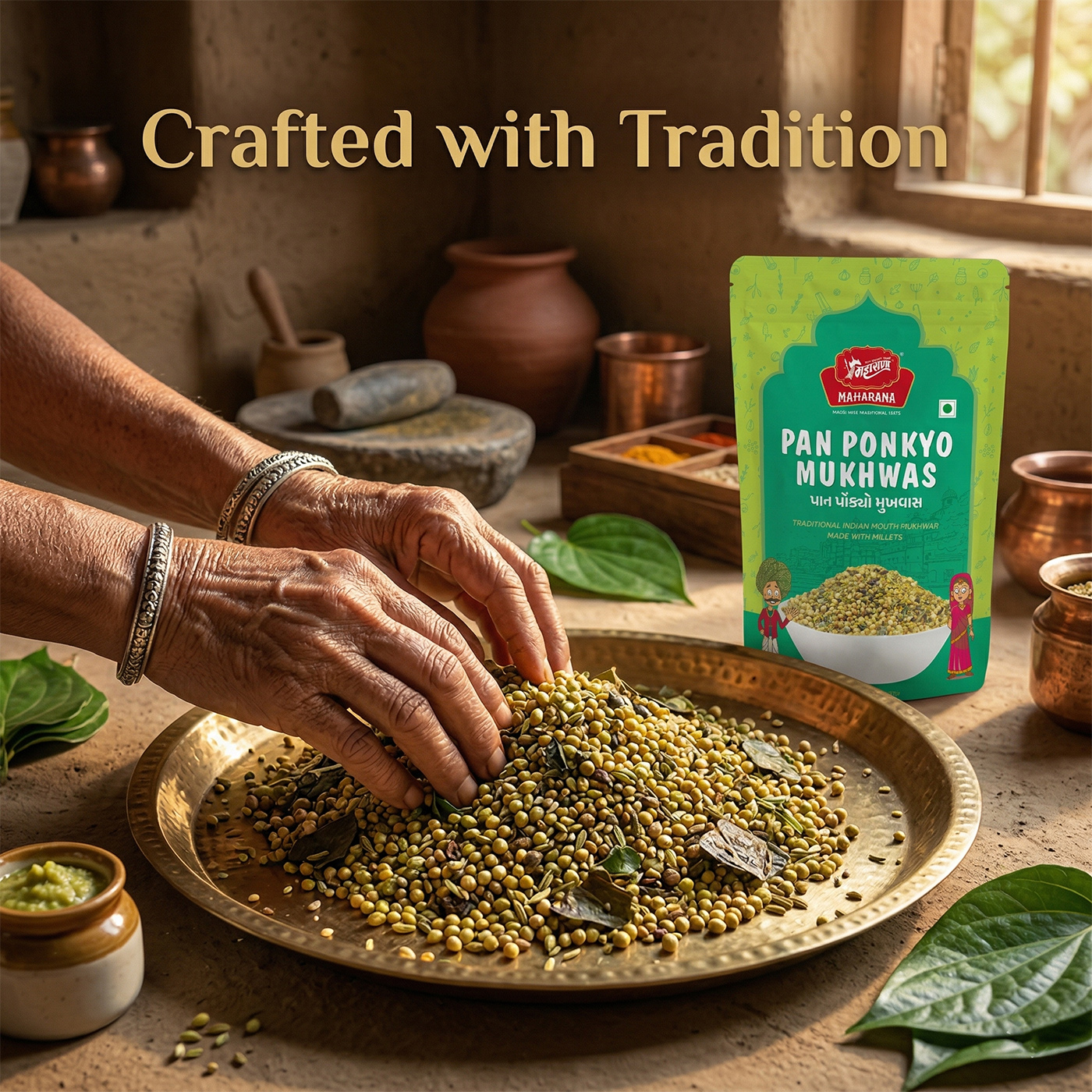 Pan ponkyo mukhwas is a traditional mouth freshener and digestive aid made from a mixer of roasted and salted fennel seeds, coriander seeds, sesame seeds, roasted jowar, and betel leaves. it is designed to refresh the breath and support digestion after meals.