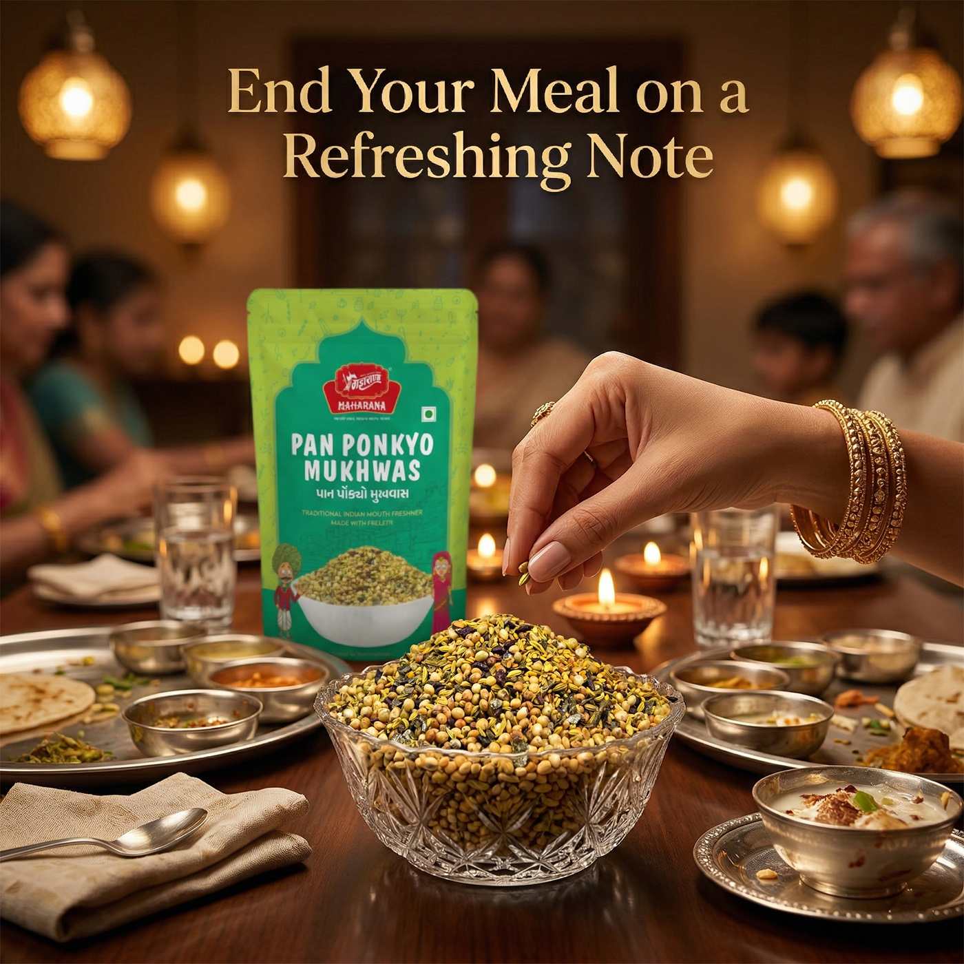 Take a small pinch of pan ponkyo mukhwas after meals and chew slowly. this helps in aiding digestion and freshening the breath naturally.