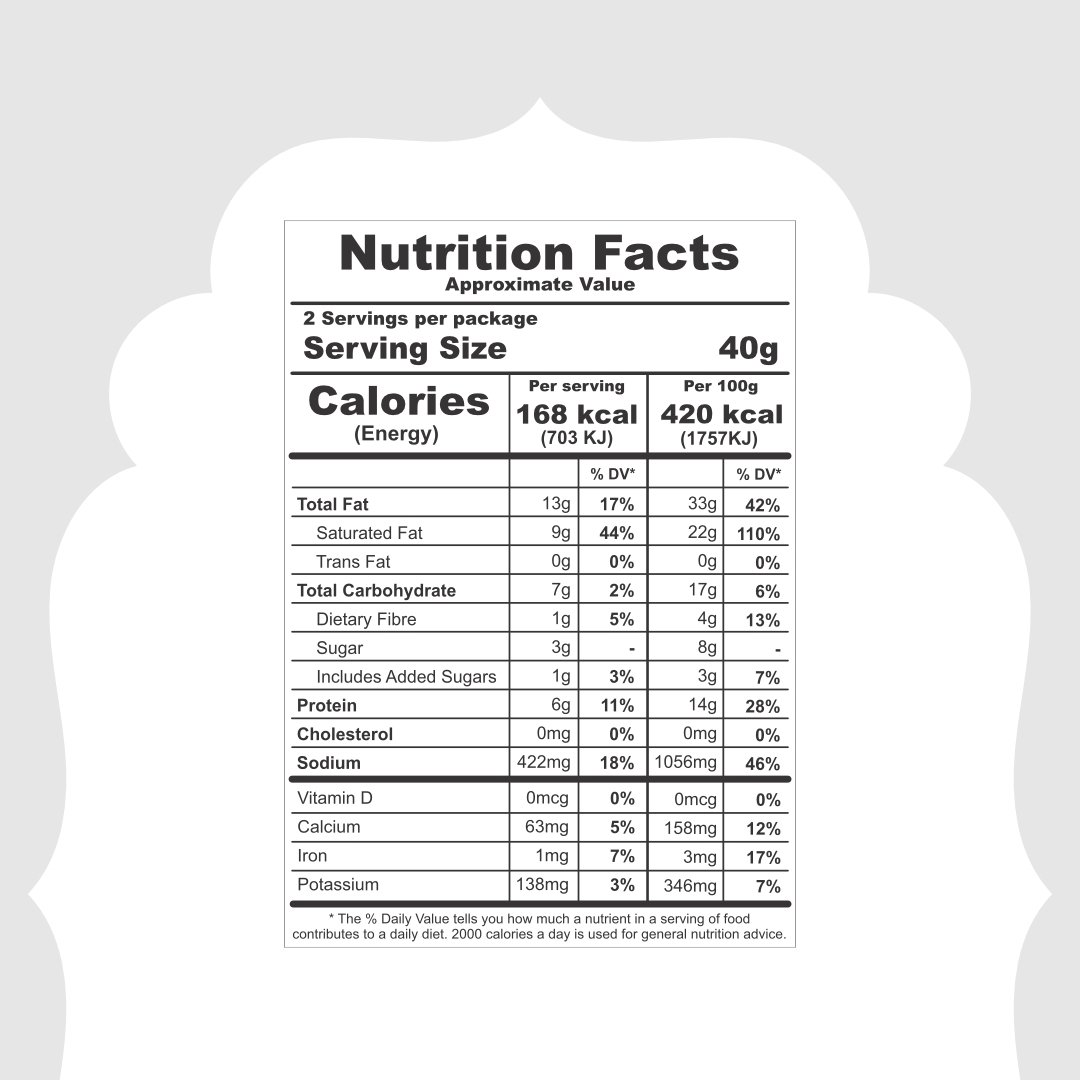 Each 80 gram pack approximately contains 160 kcal, 8 grams of protein, 10 grams of fat, and 8 grams of carbohydrates, making it a balanced source of energy and protein.