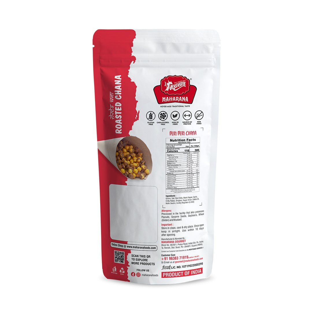 The main ingredients include premium roasted chickpeas (chana), edible oil, peri peri spice blend composed of red chili, garlic, paprika, salt, sugar, and an acidity regulator (citric acid).