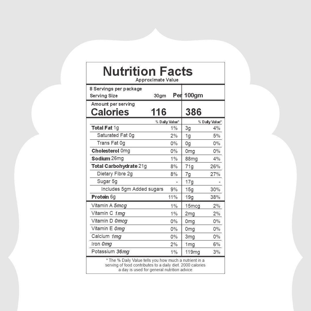 Peri peri chana is a natural source of protein with approximately 22 grams of protein per 100 grams serving, along with energy (480 kcal), carbohydrates (50g), fat (20g), and fiber (8g).