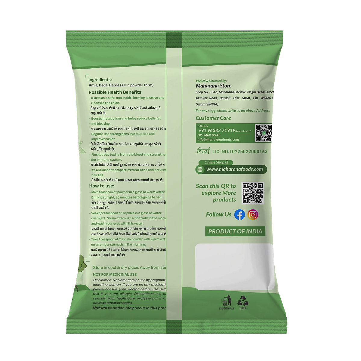 Triphala powder is available in 250 gram and 500 gram sizes, with the product weight being 500 grams for this specific pack.