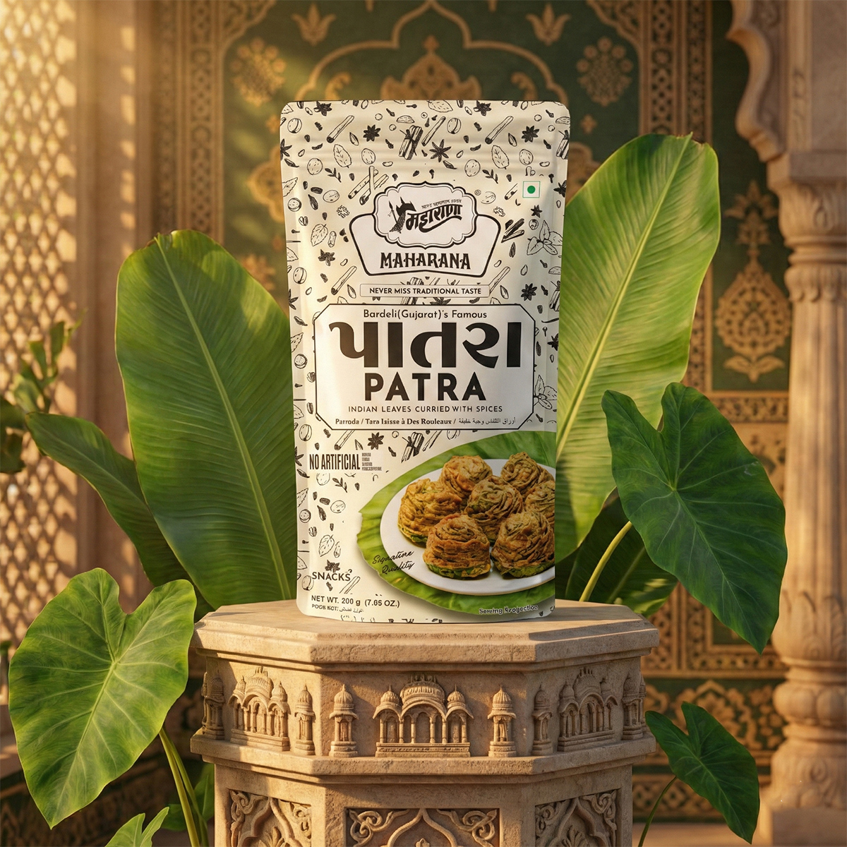 Premium patra is a traditional gujarati snack made from tender colocasia leaves, gently rolled and spiced to perfection, then slow-cooked with a blend of indian spices for a rich and layered flavor.