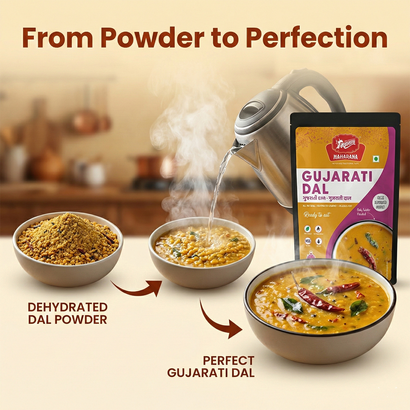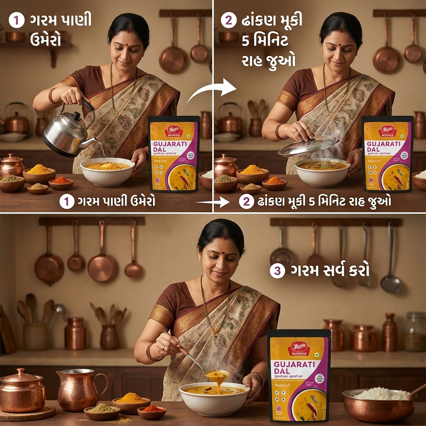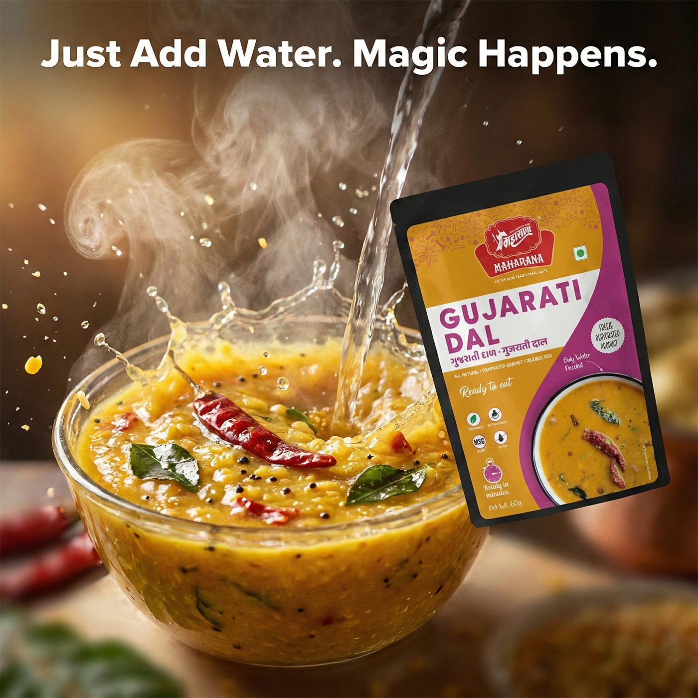 To prepare gujarati dal, open the pack and remove the food-grade oxygen absorber. then pour the contents into a bowl, add boiling water as directed on the pack, cover the bowl for 5 minutes, stir well, and serve.