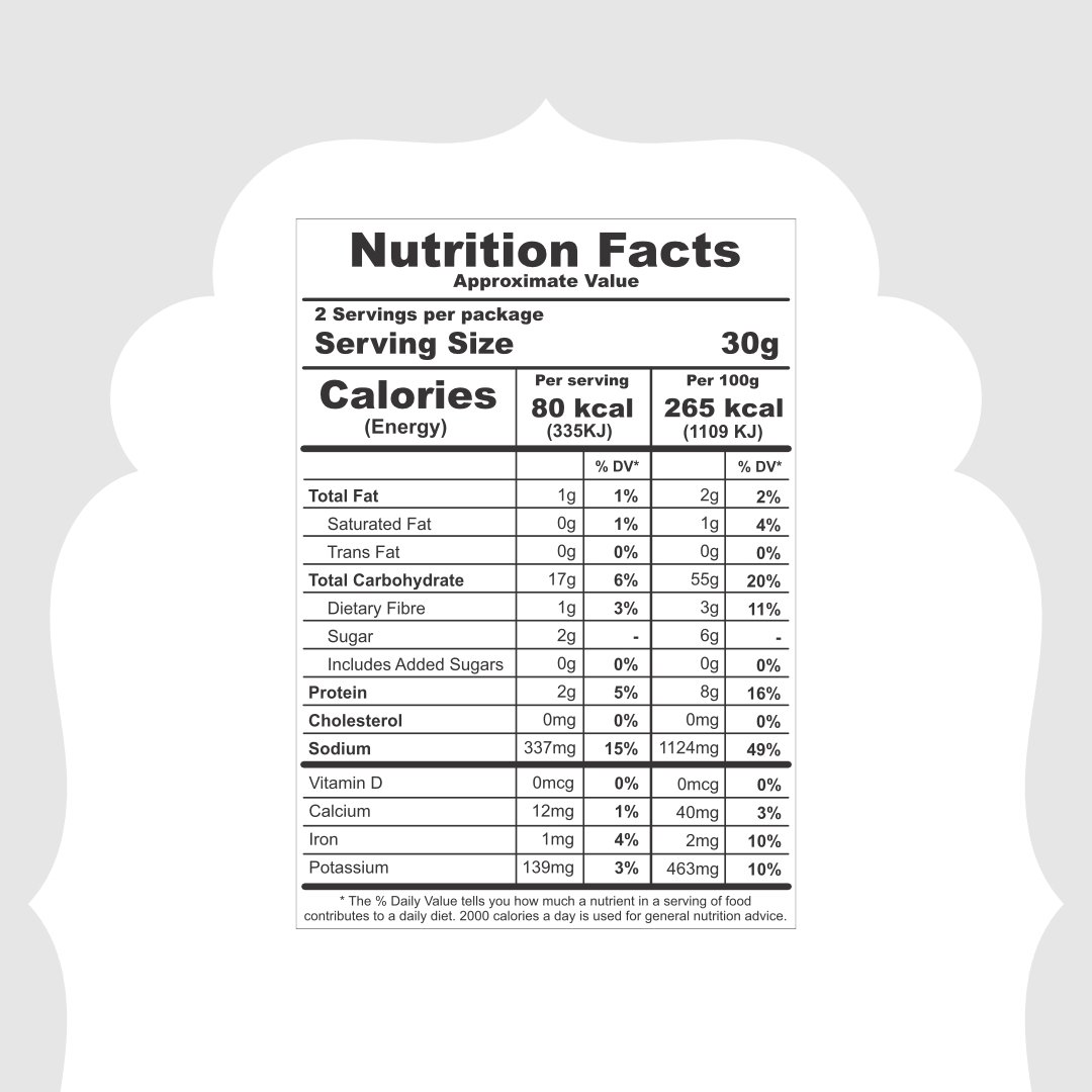 Each 60g pack provides approximately 120 kcal of energy, 6g of protein, 18g of carbohydrates, 1.5g of fat, 3g of fiber, and 220mg of sodium, making it a nutritious and balanced meal option.