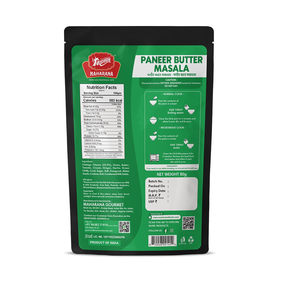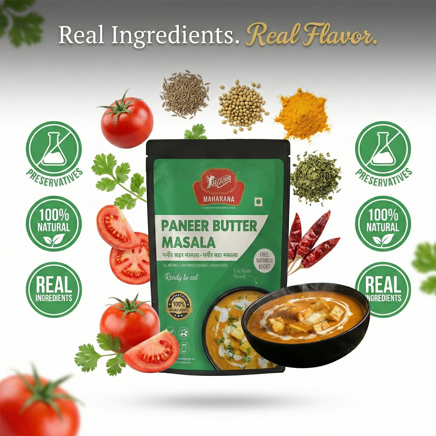 It contains paneer, tomato puree, cream powder, refined spices, sugar, and salt, all made from premium all-natural ingredients with no artificial flavors, colors, or preservatives.