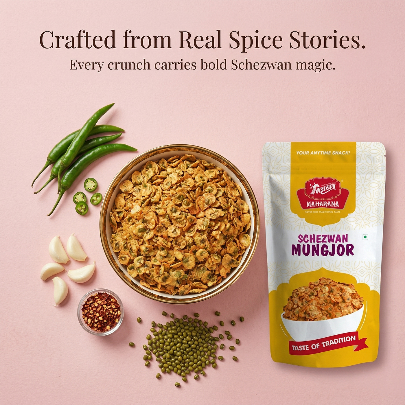 Schezwan mungjor is prepared by cooking moong lentils, flattening them, baking without oil, and seasoning with a special schezwan spice mix, rice flour, salt, and natural flavors.