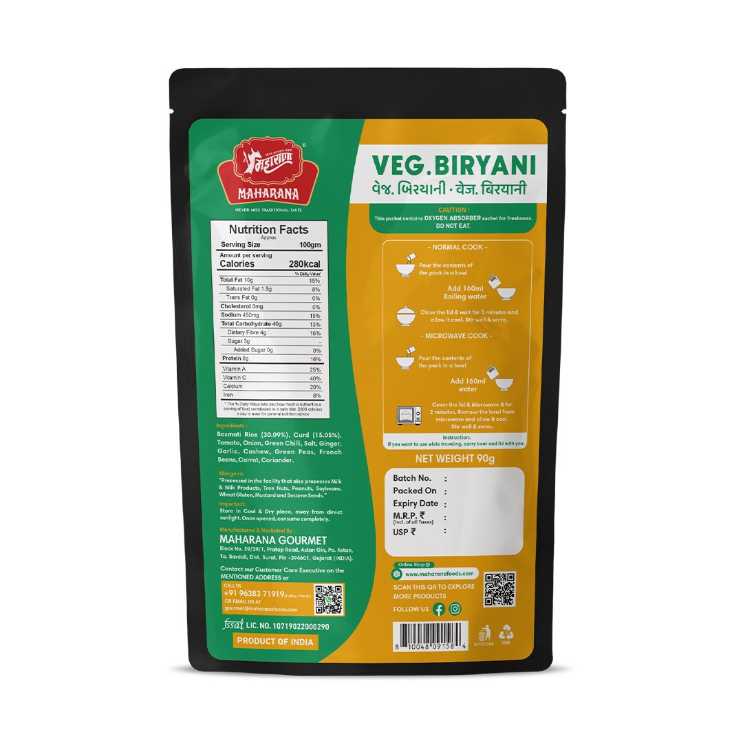 Maharana veg biryani is ready in approximately 5 minutes, making it ideal for quick lunches, dinners, or travel-friendly meals.